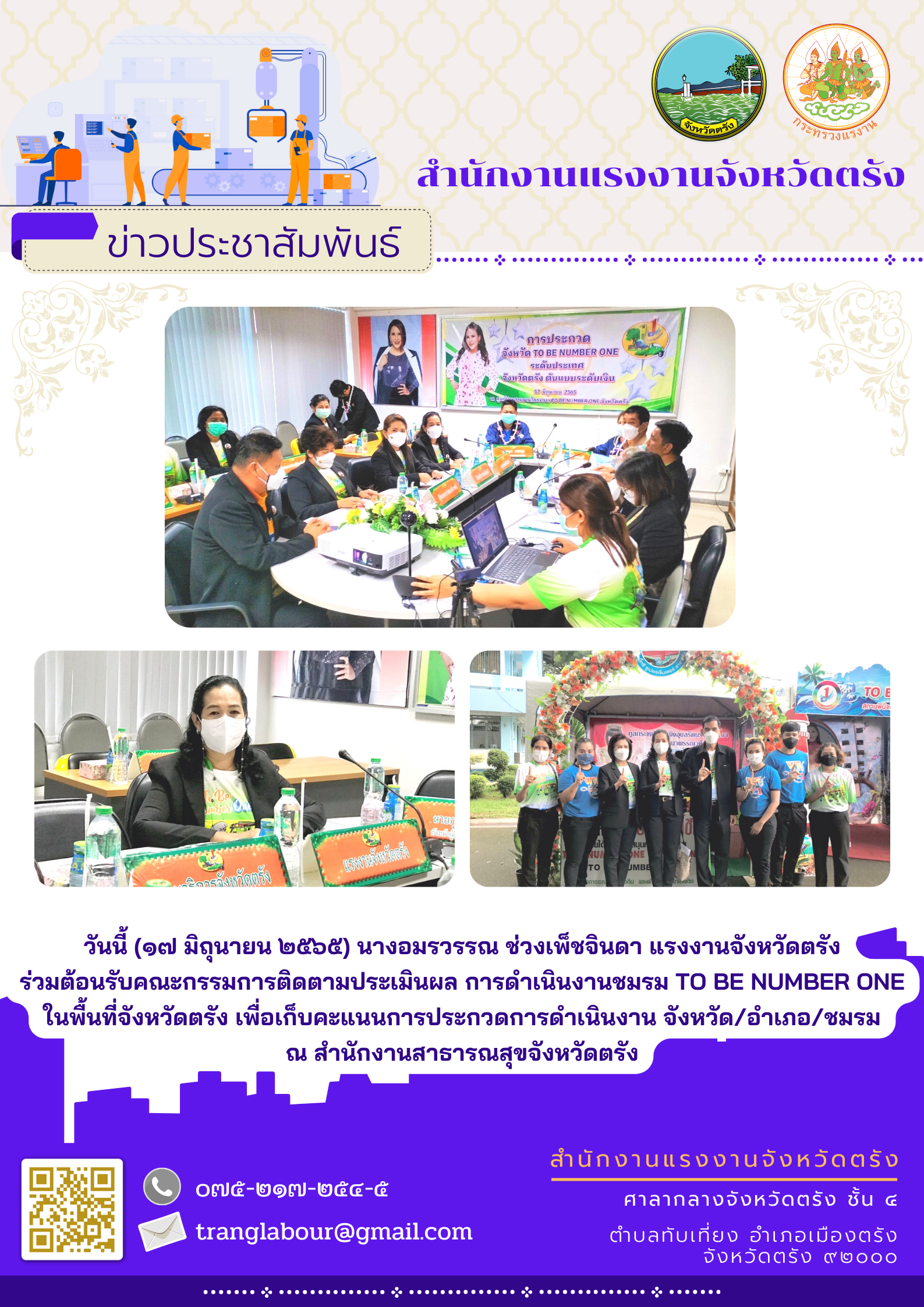 แรงงานจังหวัดตรัง ร่วมร่วมต้อนรับคณะกรรมการติดตามประเมินผล การดำเนินงานชมรมTO BE NUMBER ONE ในพื้นที่จังหวัดตรัง ณ สำนักงานสาธารณสุขจังหวัดตรัง