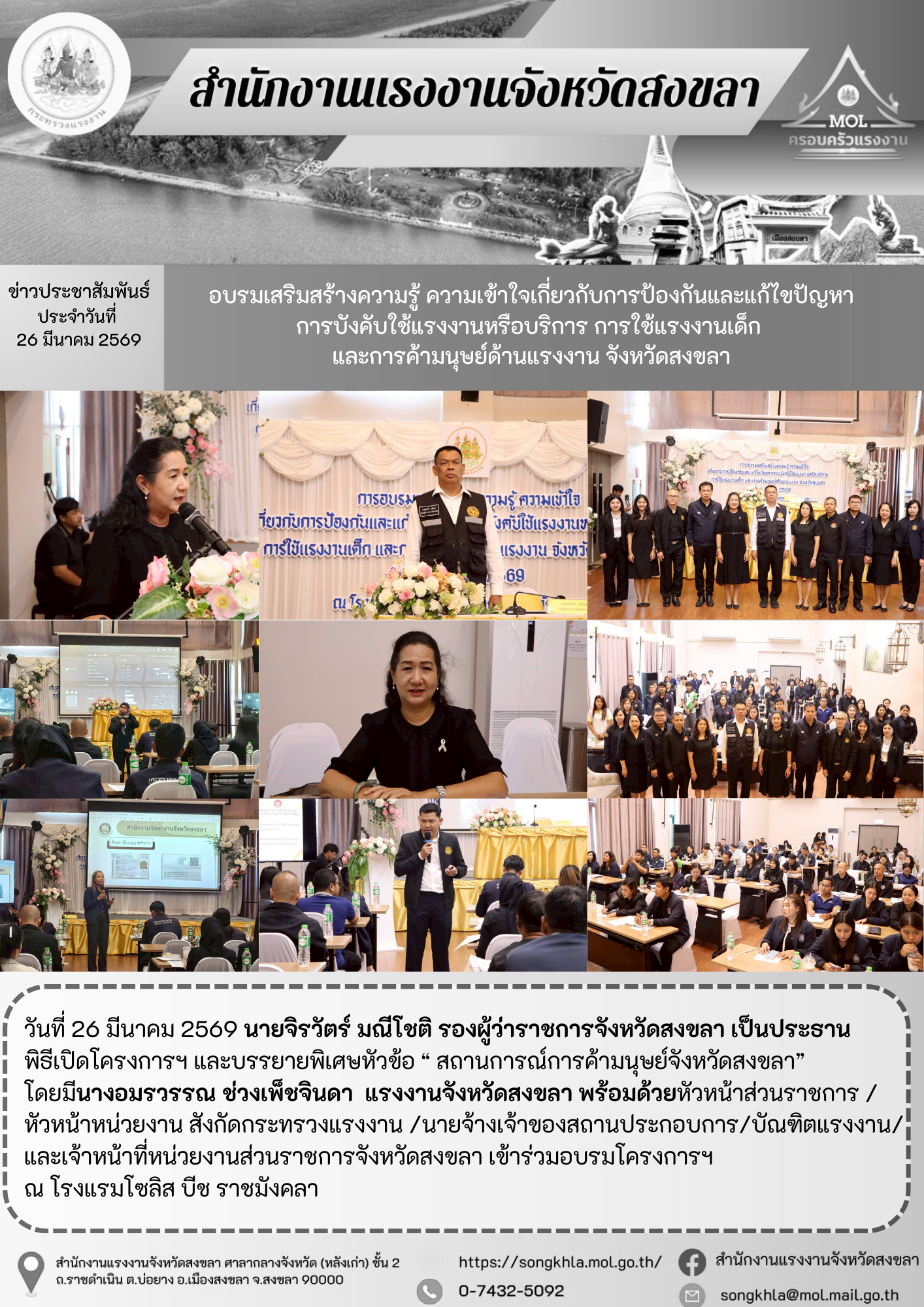 อบรมเสริมสร้างความรู้ ความเข้าใจเกี่ยวกับการป้องกันและแก้ไขปัญหา การบังคับใช้แรงงานหรือบริการ การใช้แรงงานเด็ก และการค้ามนุษย์ด้านแรงงาน จังหวัดสงขลา