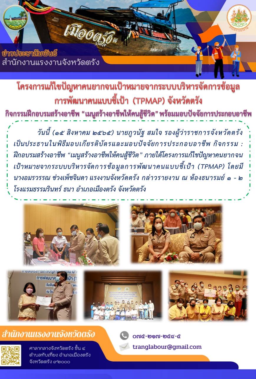 สำนักงานแรงงานจังหวัดตรัง ได้จัดอบรมให้ความรู้ช่องทางการตลาดและพัฒนาผลิตภัณฑ์ และมอบเกียรติบัตร พร้อมมอบปัจจัยการประกอบอาชีพให้แก่ผู้ผ่านการฝึกอบรมอาชีพ