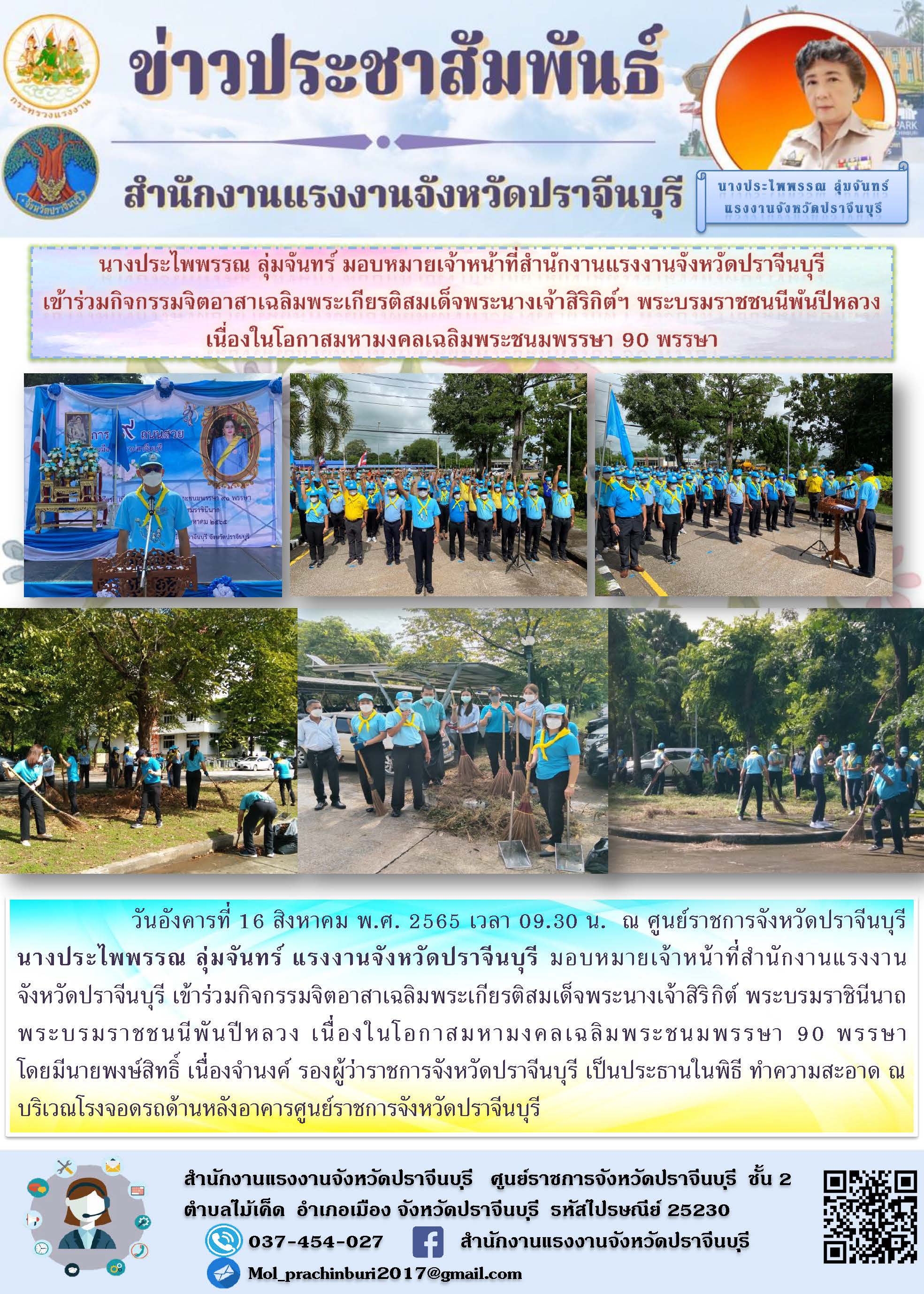 นางประไพพรรณ ลุ่มจันทร์ มอบหมายเจ้าหน้าที่สำนักงานแรงงานจังหวัดปราจีนบุรี เข้าร่วมกิจกรรมจิตอาสาเฉลิมพระเกียรติสมเด็จพระนางเจ้าสิริกิต์ฯ พระบรมราชชนนีพันปีหลวง เนื่องในโอกาสมหามงคลเฉลิมพระชนมพรรษา 90 พรรษา
