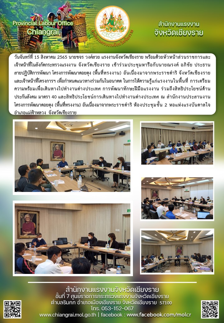 แรงงานจังหวัดเชียงรายร่วมประชุมบูรณาการเพื่อกำหนดแผนงานให้ความรู้ด้านแรงงานในพื้นที่ ในการไปทำงานต่างประเทศและพัฒนาทักษะฝีมือร่วมกับโครงการพัฒนาดอยตุง(พื้นที่ทรงงาน)