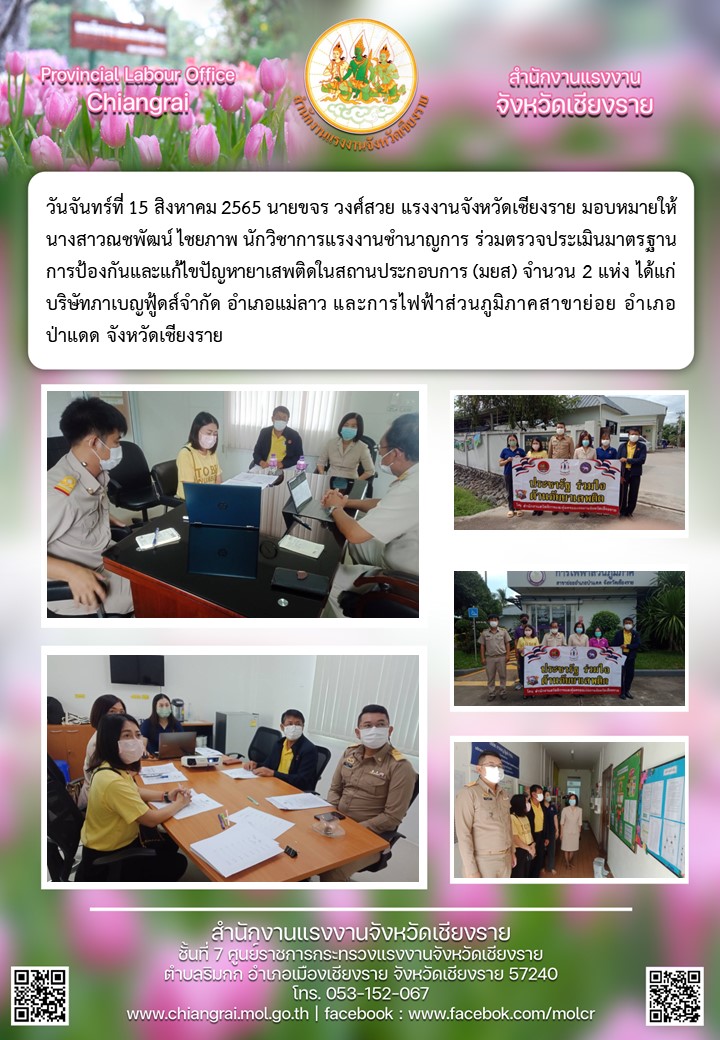 สรจ.ชร ร่วมตรวจประเมินมาตราฐานการป้องกันและแก้ไขปัญหายาเสพติดในสถานประกอบกิจการ(มยส)