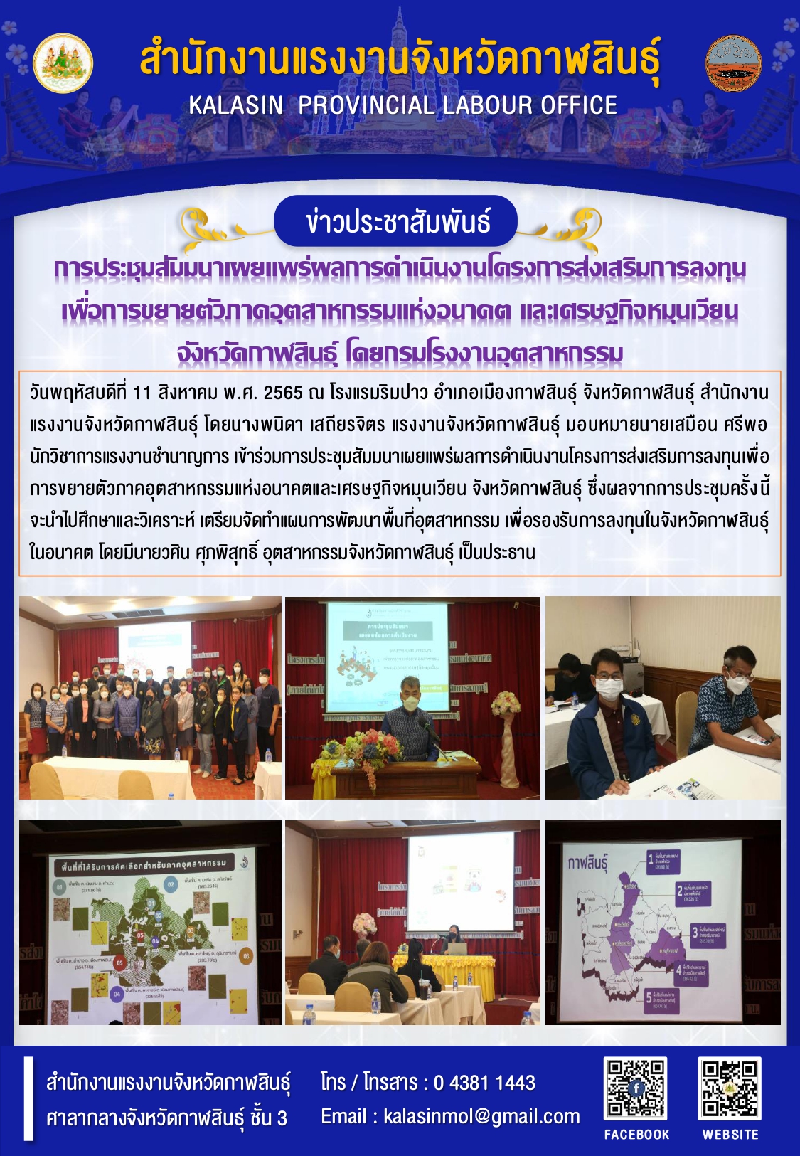 สรจ.กาฬสินธุ์ ร่วมการประชุมสัมมนาเผยแพร่ผลการดำเนินงานโครงการส่งเสริมการลงทุนเพื่อการขยายตัวภาคอุตสาหกรรมแห่งอนาคตและเศรษฐกิจหมุนเวียน จังหวัดกาฬสินธุ์
