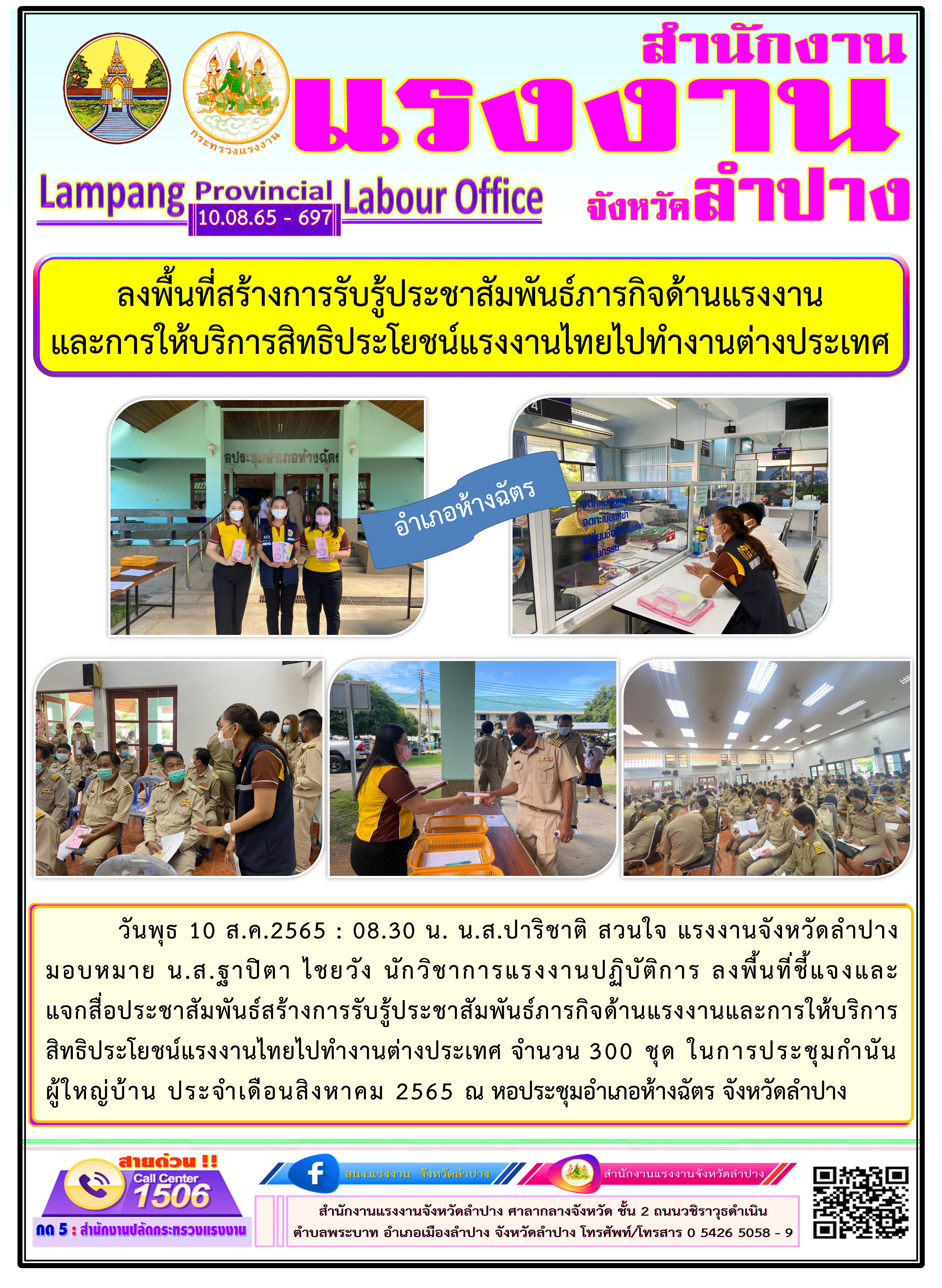 ลงพื้นที่สร้างการรับรู้ประชาสัมพันธ์ภารกิจด้านแรงงาน และการให้บริการสิทธิประโยชน์แรงงานไทยไปทำงานต่างประเทศ