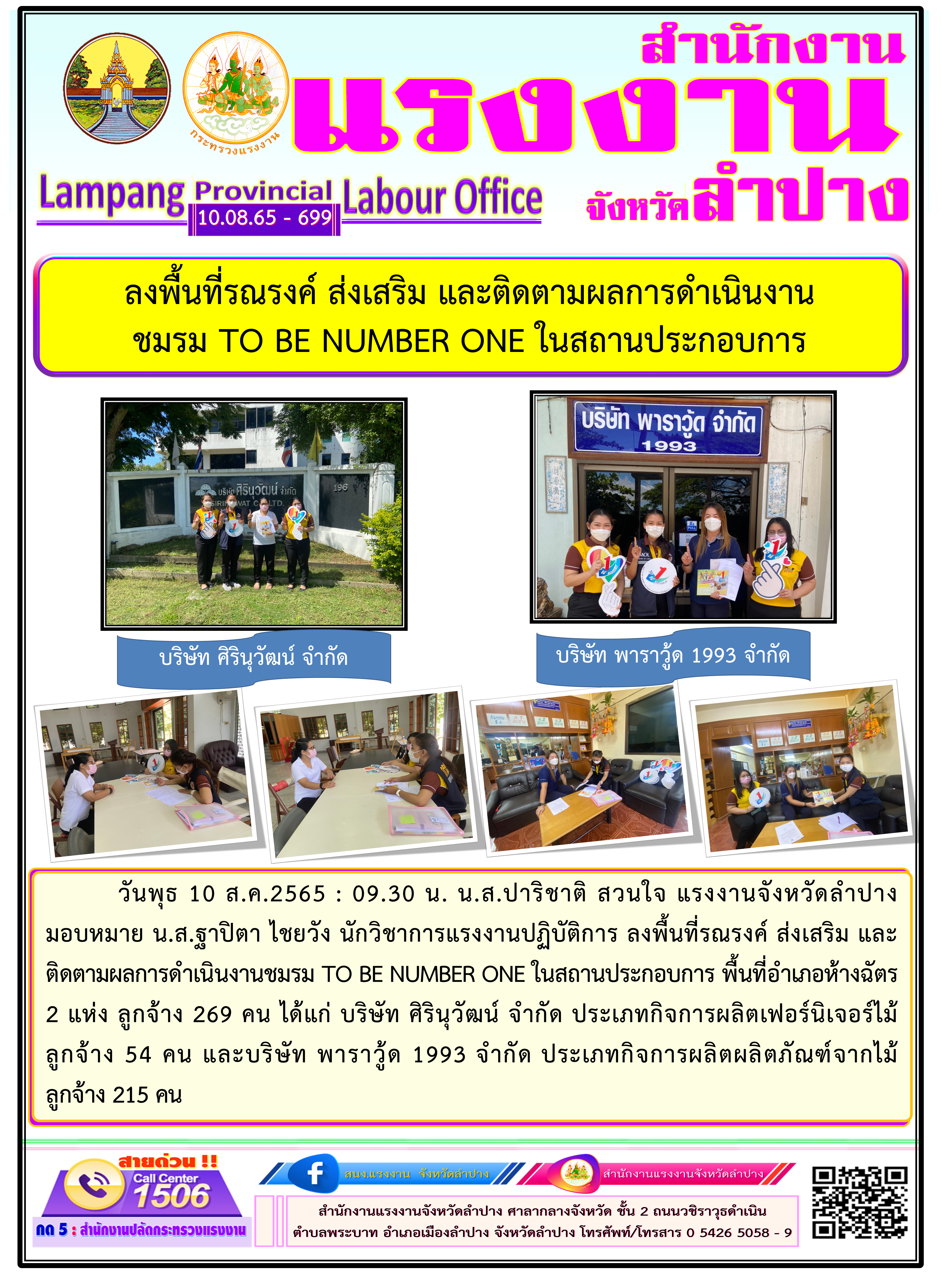 ลงพื้นที่รณรงค์ ส่งเสริม และติดตามผลการดำเนินงาน ชมรม TO BE NUMBER ONE ในสถานประกอบการ