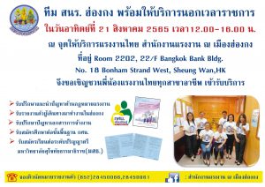 ทีม สนร. ฮ่องกง พร้อมให้บริการนอกเวลาราชการ ณ จุดให้บริการแรงงานไทย สำนักงานแรงงาน ณ เมืองฮ่องกง ในวันอาทิตย์ที่ 21 สิงหาคม 2565
