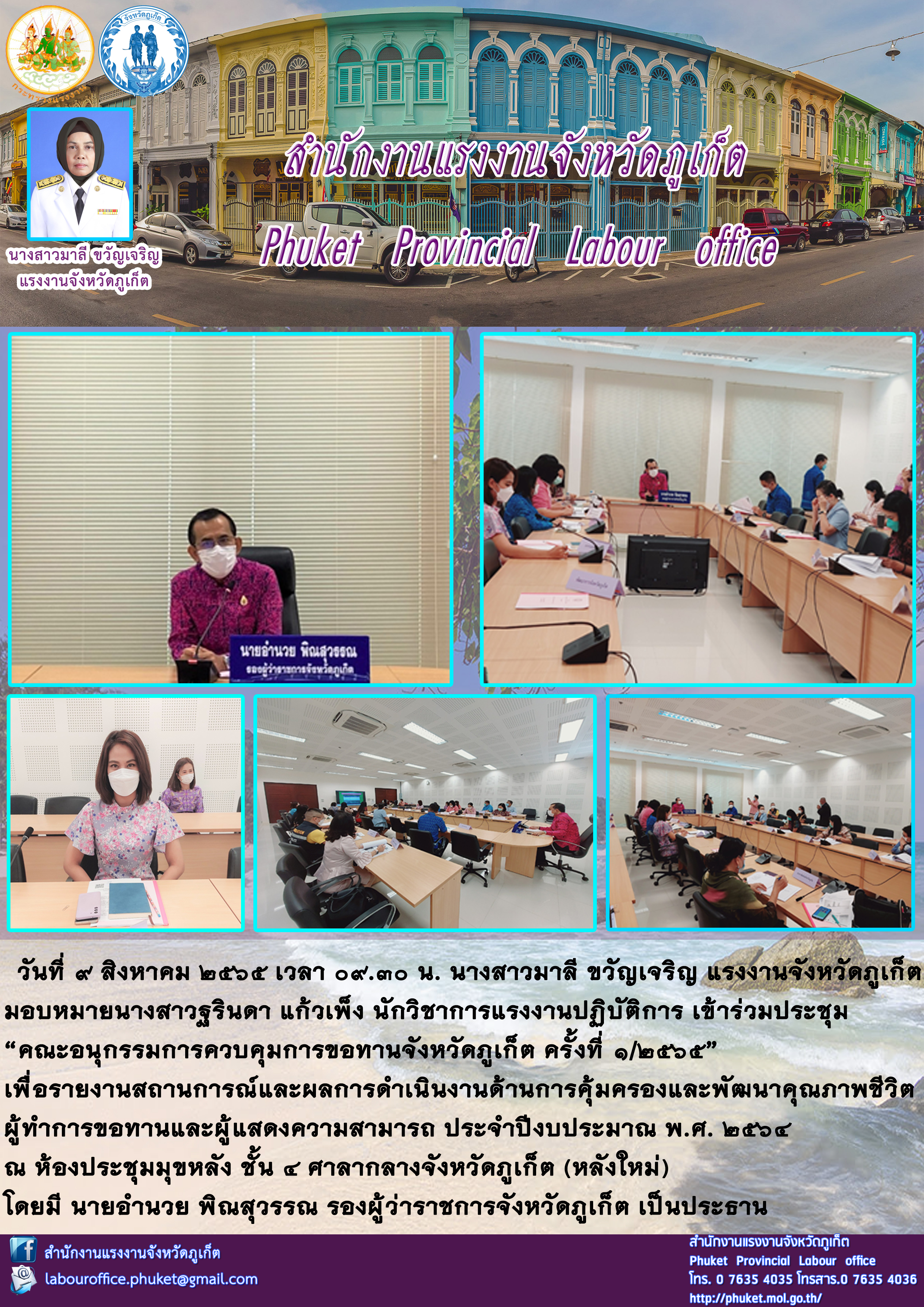 นางสาวมาลี ขวัญเจริญ แรงงานจังหวัดภูเก็ต มอบหมายนางสาวฐรินดา แก้วเพ็ง นักวิชาการแรงงานปฏิบัติการ เข้าร่วมประชุม “คณะอนุกรรมการควบคุมการขอทานจังหวัดภูเก็ต ครั้งที่ 1/2565”