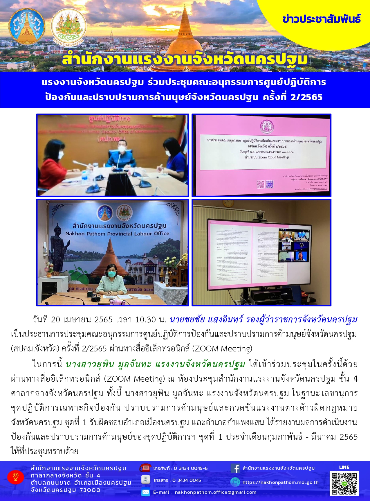 แรงงานจังหวัดนครปฐม ร่วมประชุมคณะอนุกรรมการศูนย์ปฏิบัติการป้องกันและปราบปรามการค้ามนุษย์จังหวัดนครปฐม ครั้งที่ 2/2565