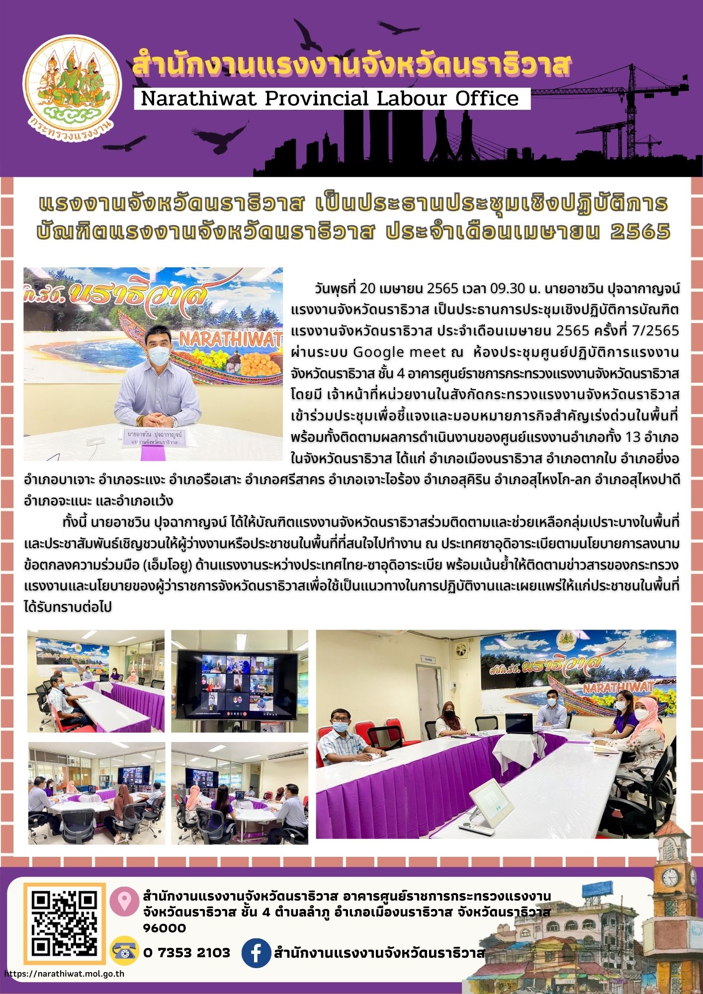 แรงงานจังหวัดนราธิวาส เป็นประธานประชุมเชิงปฏิบัติการบัณฑิตแรงงานจังหวัดนราธิวาส ประจำเดือนเมษายน 2565