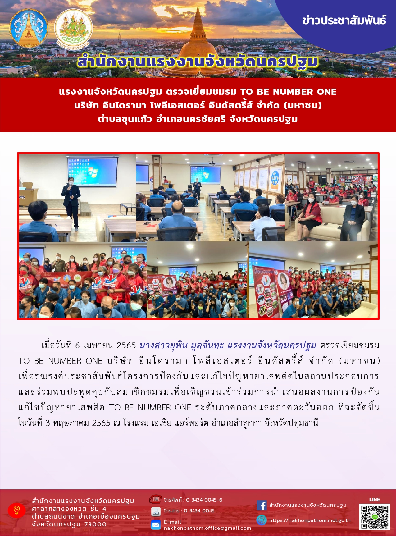 แรงงานจังหวัดนครปฐม ตรวจเยี่ยมชมรม TO BE NUMBER ONE บริษัท อินโดรามา โพลีเอสเตอร์ อินดัสตรี้ส์ จำกัด (มหาชน) ตำบลขุนแก้ว อำเภอนครชัยศรี จังหวัดนครปฐม
