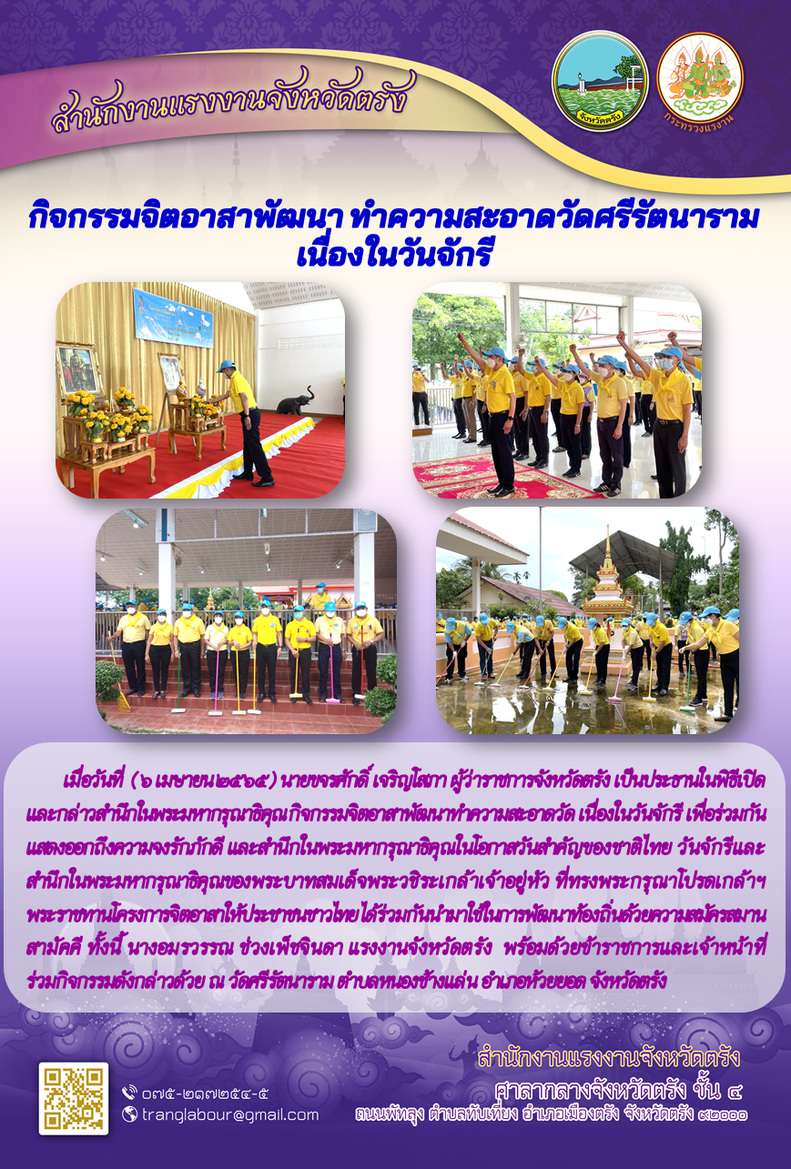 แรงงานจังหวัดตรัง พร้อมด้วยข้าราชการและเจ้าหน้าที่ ร่วมกิจกรรมจิตอาสาพัฒนาทำความสะอาดวัดศรีรัตนาราม เนื่องในวันจักรี