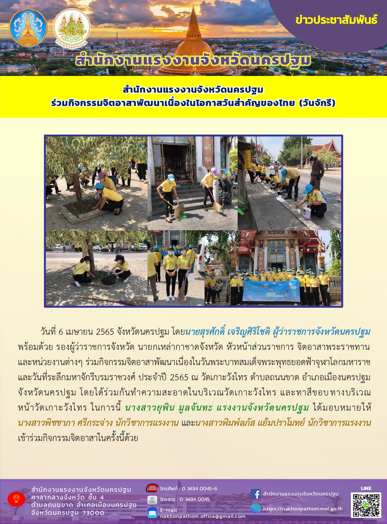 สำนักงานแรงงานจังหวัดนครปฐม ร่วมกิจกรรมจิตอาสาพัฒนาเนื่องในโอกาสวันสำคัญของไทย (วันจักรี)