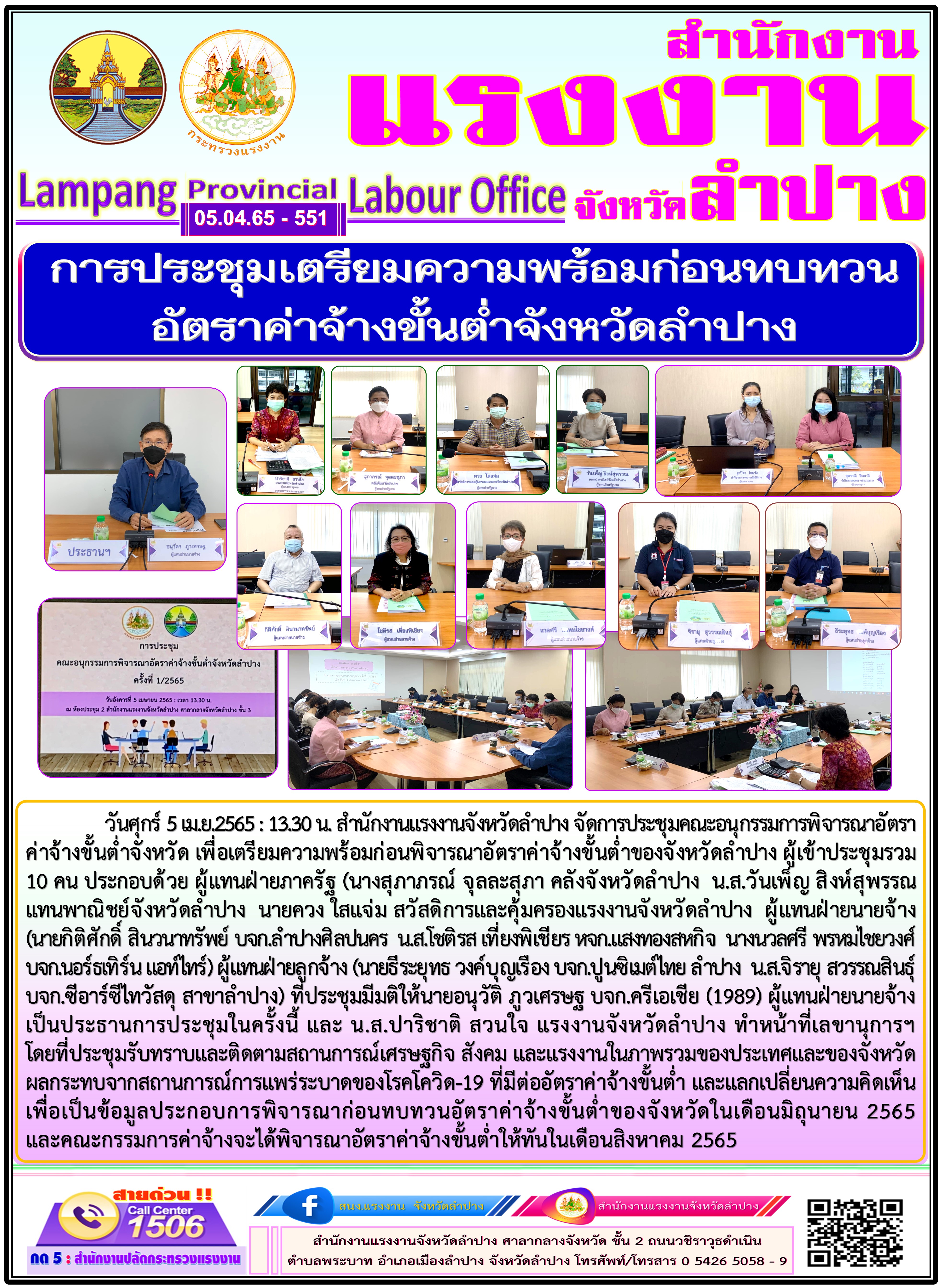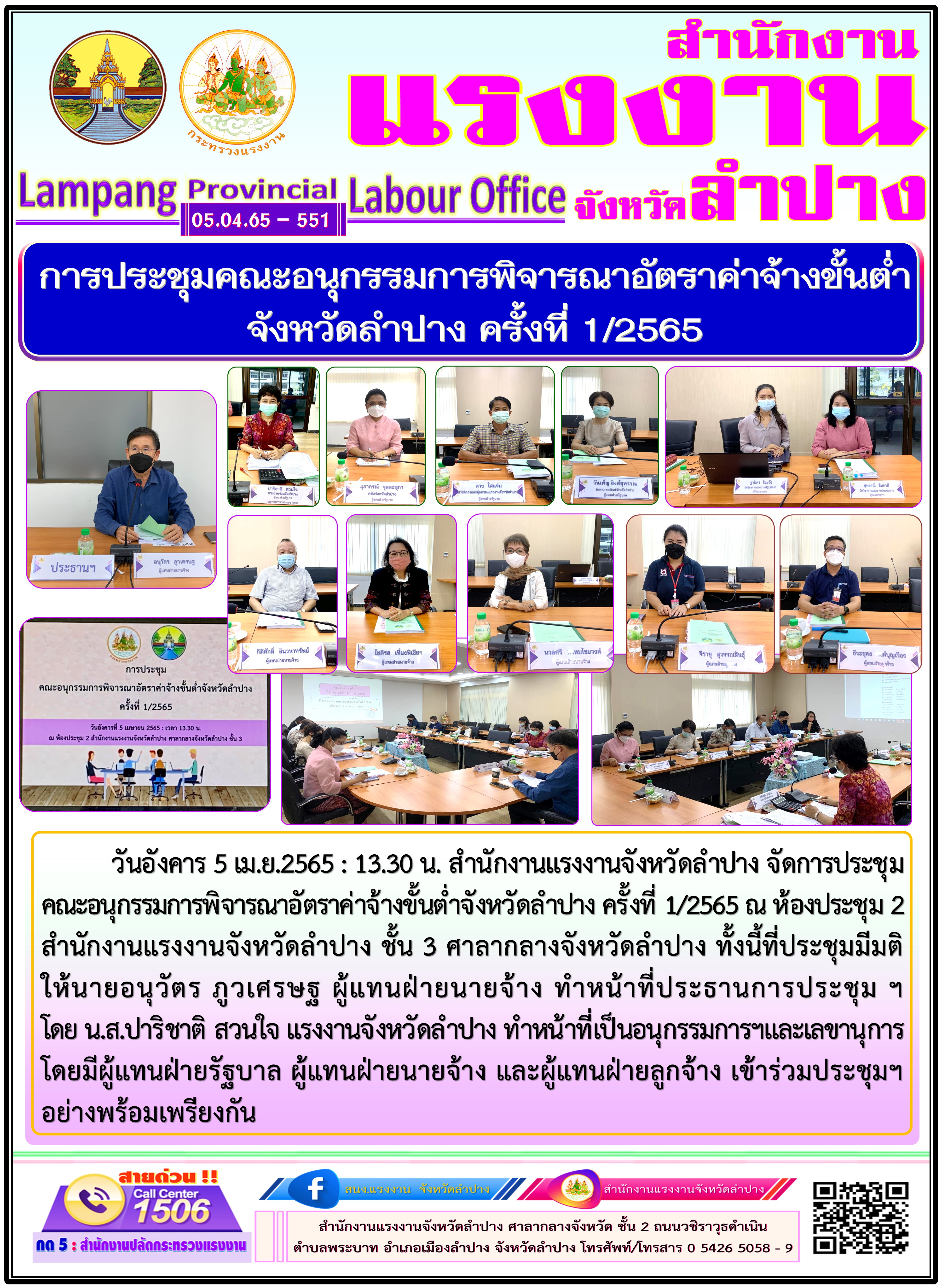 สำนักงานแรงงานจังหวัดลำปาง จัดการประชุมคณะอนุกรรมการพิจารณาอัตราค่าจ้างขั้นต่ำจังหวัดลำปาง ครั้งที่ 1/2565
