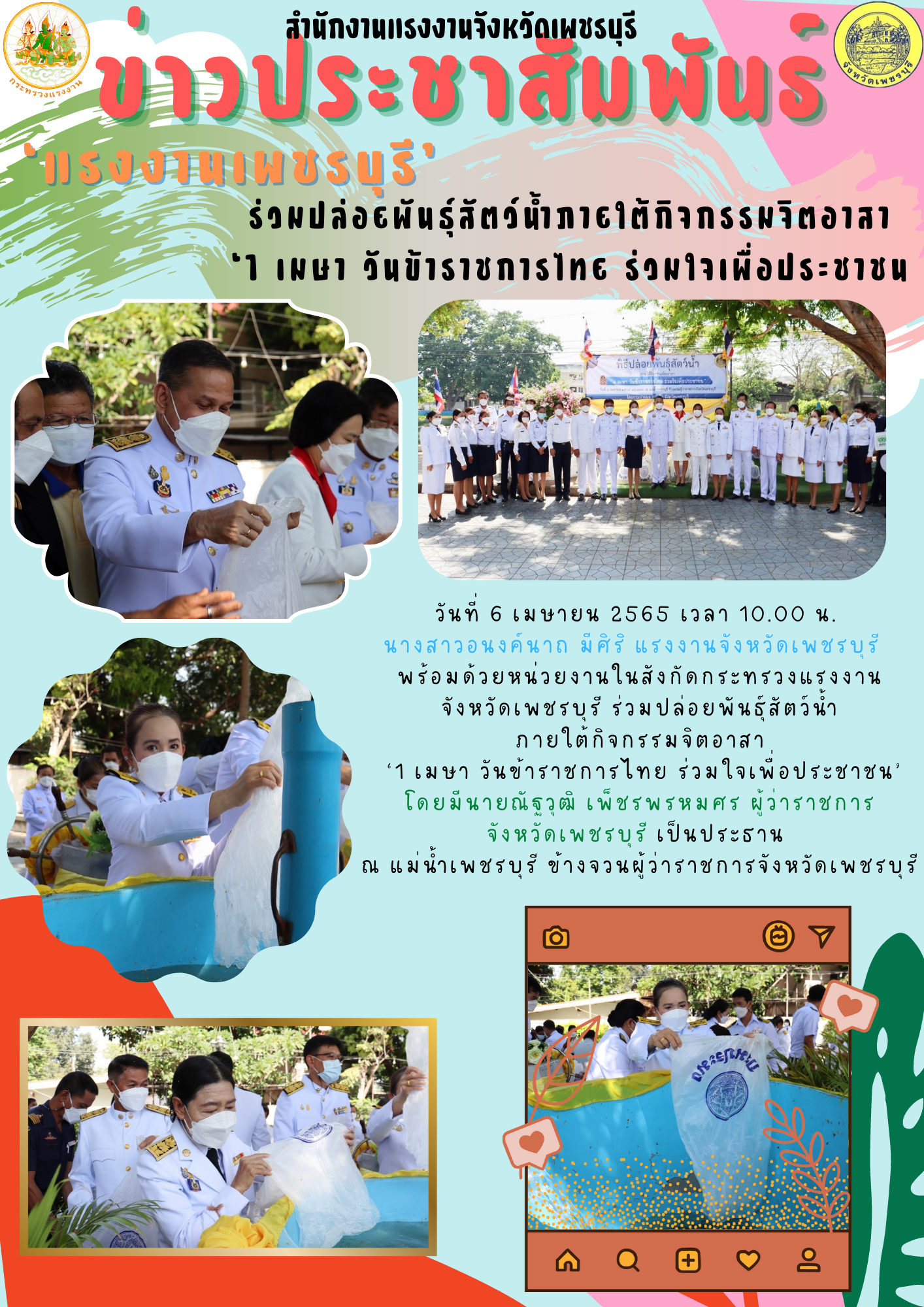 ‘แรงงานเพชรบุรี’ ร่วมปล่อยพันธุ์สัตว์น้ำภายใต้กิจกรรมจิตอาสา ‘1 เมษา วันข้าราชการไทย ร่วมใจเพื่อประชาชน’
