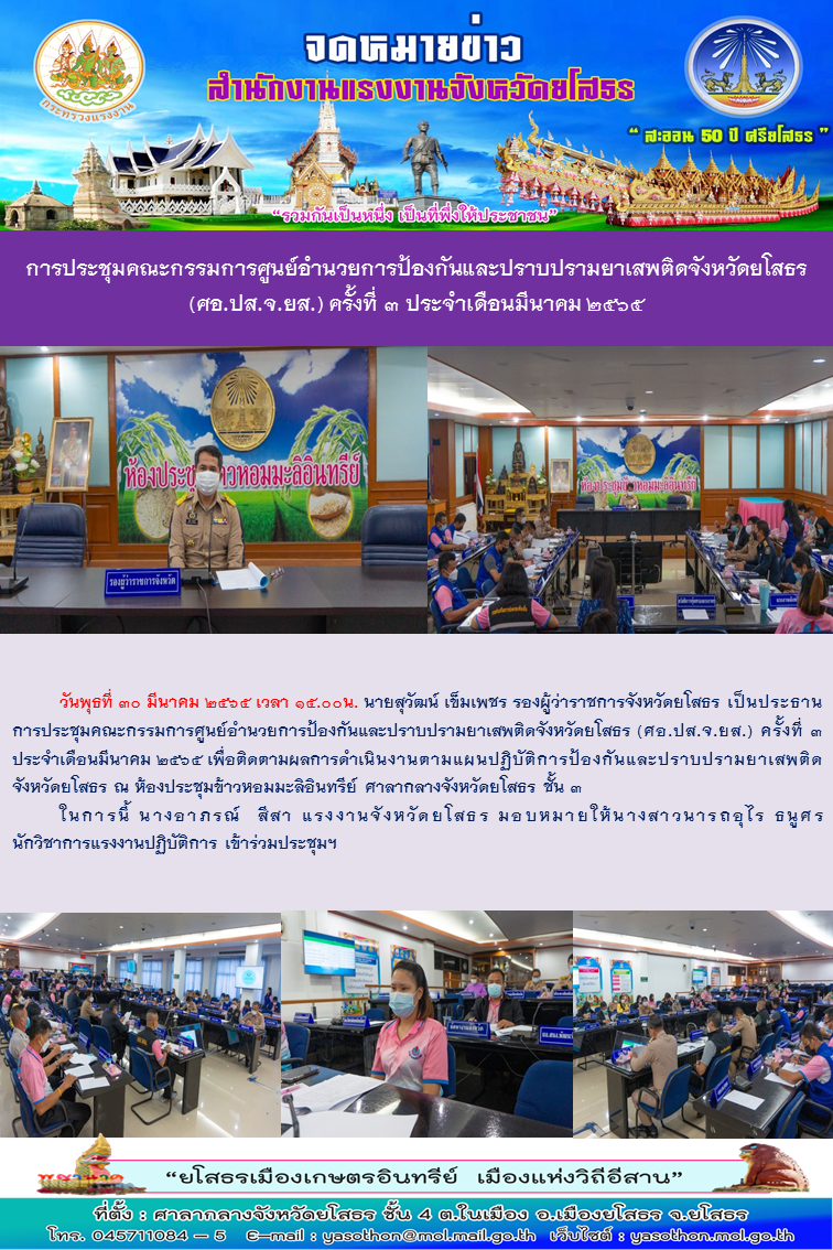 การประชุมคณะกรรมการศูนย์อำนวยการป้องกันและปราบปรามยาเสพติดจังหวัดยโสธร (ศอ.ปส.จ.ยส.) ครั้งที่ 3 ประจำเดือนมีนาคม 2565