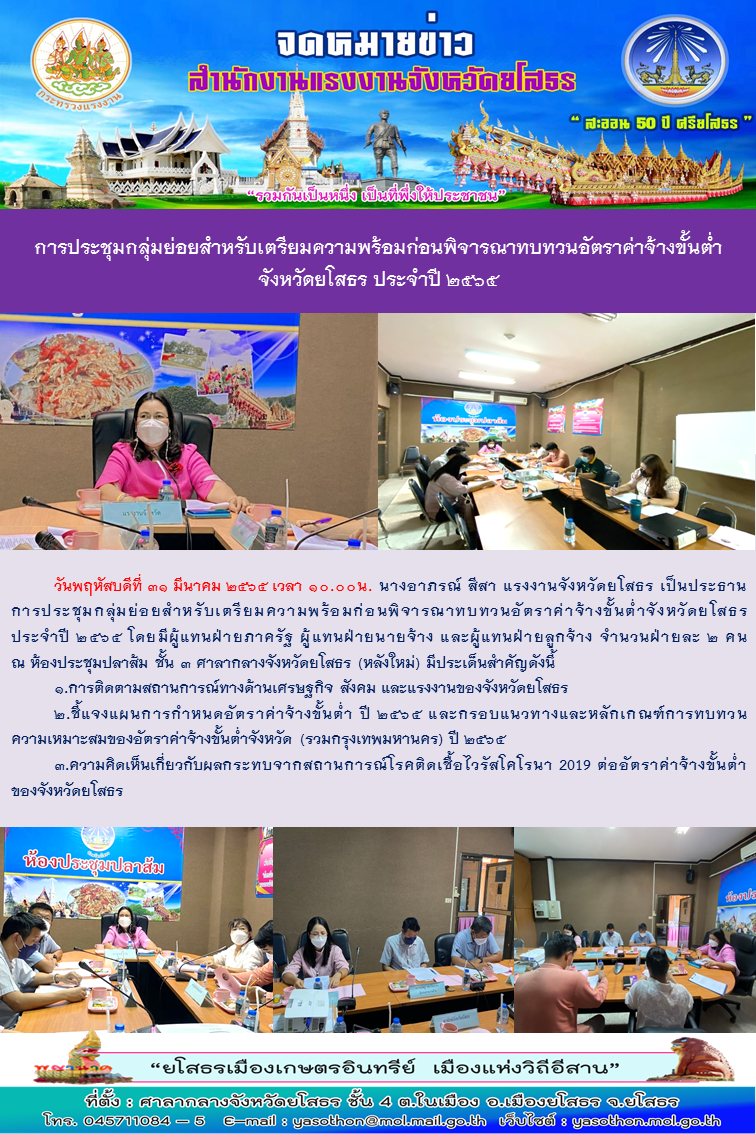 การประชุมกลุ่มย่อยสำหรับเตรียมความพร้อมก่อนพิจารณาทบทวนอัตราค่าจ้างขั้นต่ำจังหวัดยโสธร ประจำปี 2565