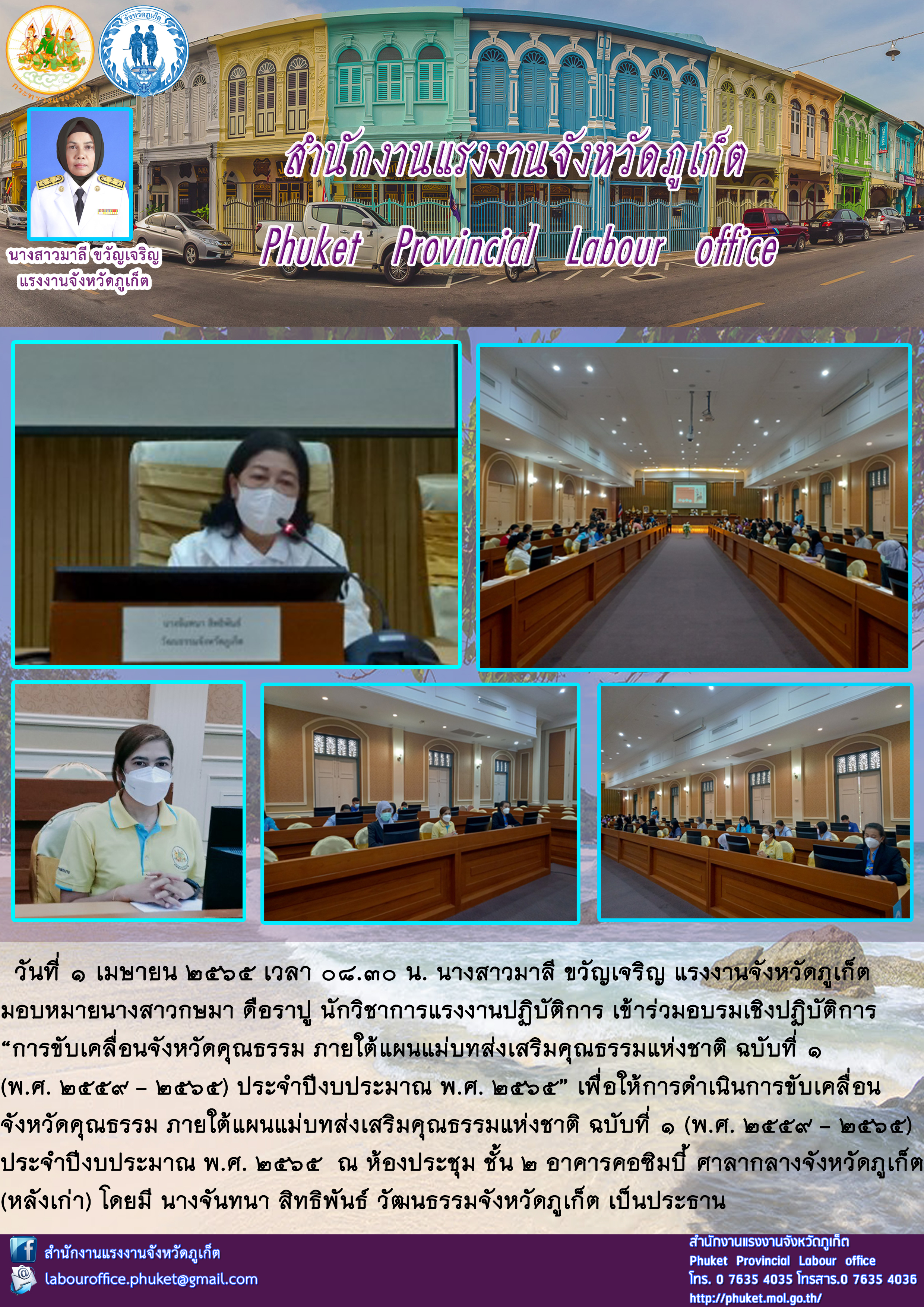 สรจ.ภูเก็ต ร่วมอบรมเชิงปฏิบัติการ “การขับเคลื่อนจังหวัดคุณธรรม ภายใต้แผนแม่บทส่งเสริมคุณธรรมแห่งชาติ ฉบับที่ 1 (พ.ศ. 2559 – 2565) ประจำปีงบประมาณ พ.ศ. 2565”