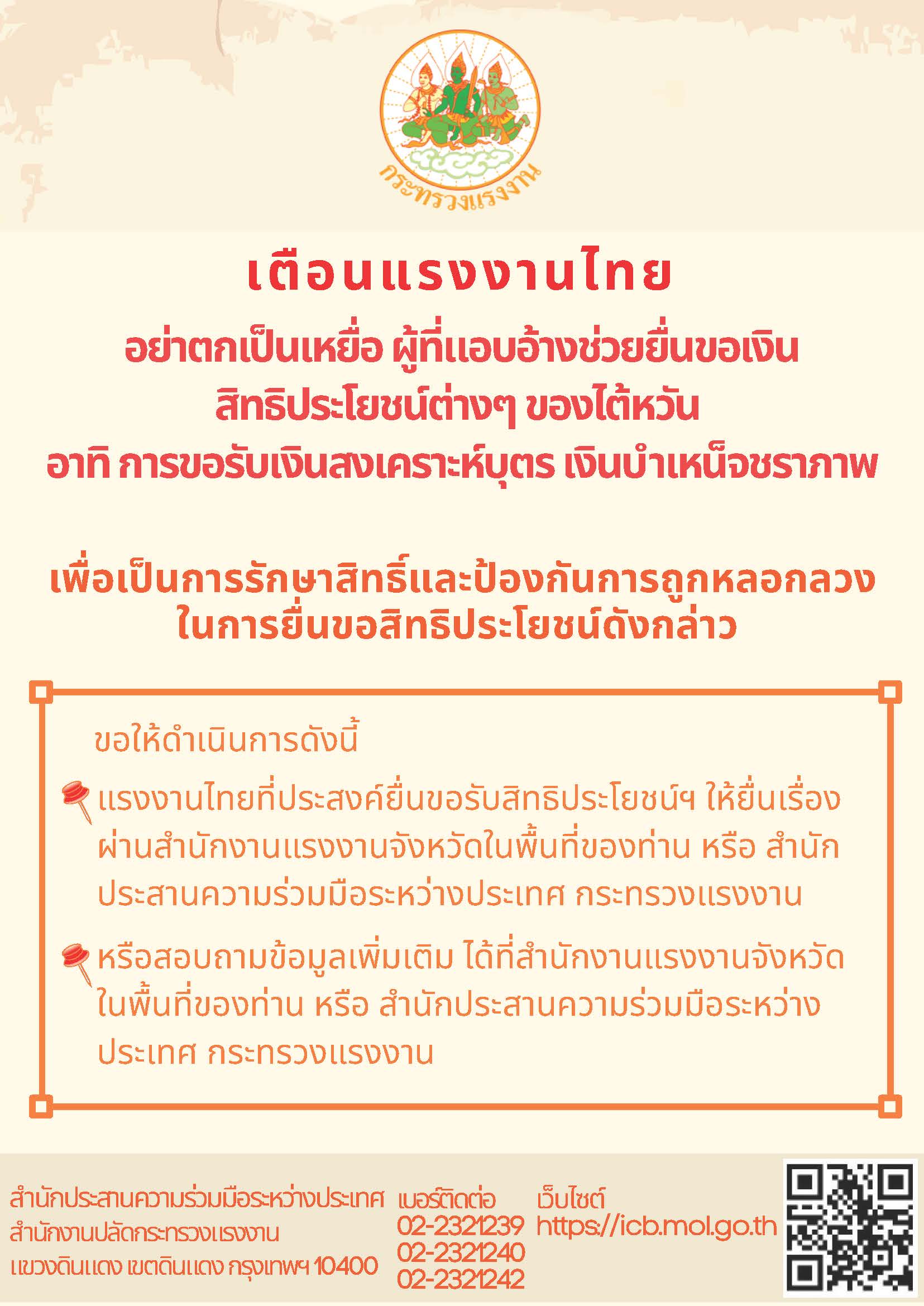 เตือนแรงงานไทย!!!! อย่าตกเป็นเหยื่อผู้แอบอ้างช่วยยื่นขอเงินสิทธิประโยชน์ต่างๆ ของไต้หวัน