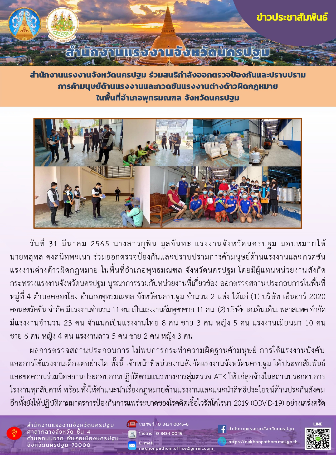 สรจ.นครปฐม ร่วมสนธิกำลังออกตรวจป้องกันและปราบปรามการค้ามนุษย์ด้านแรงงานและกวดขันแรงงานต่างด้าวผิดกฎหมาย ในพื้นที่อำเภอพุทธมณฑล จังหวัดนครปฐม