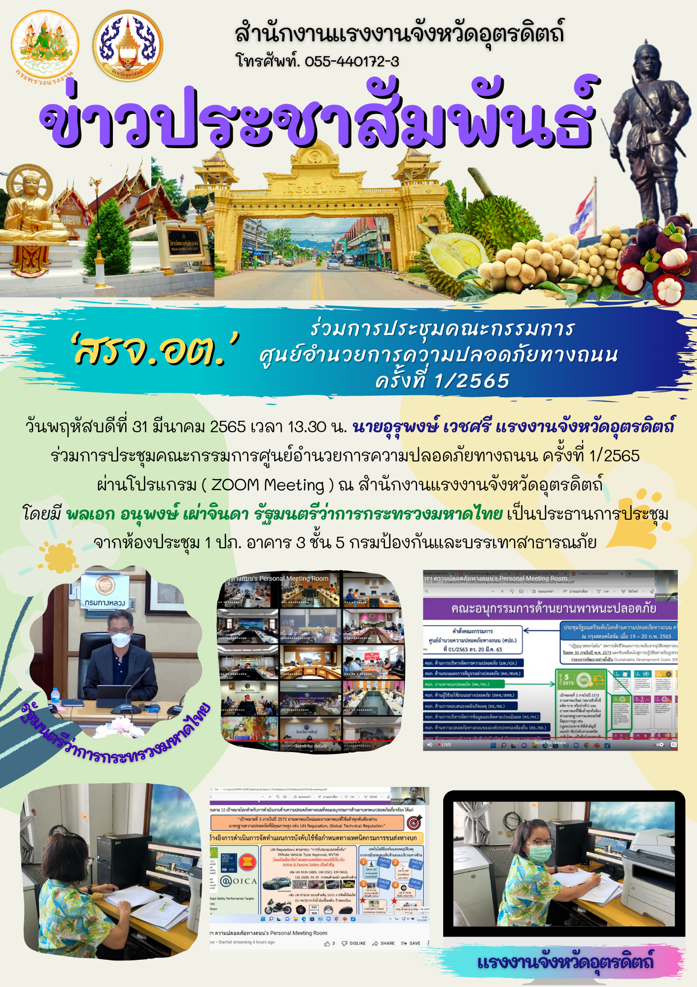 แรงงานจังหวัดตาก ร่วมติดตามการประชุมคณะกรรมการศูนย์อำนวยการความปลอดภัยทางถนน ครั้งที่ 1/2565