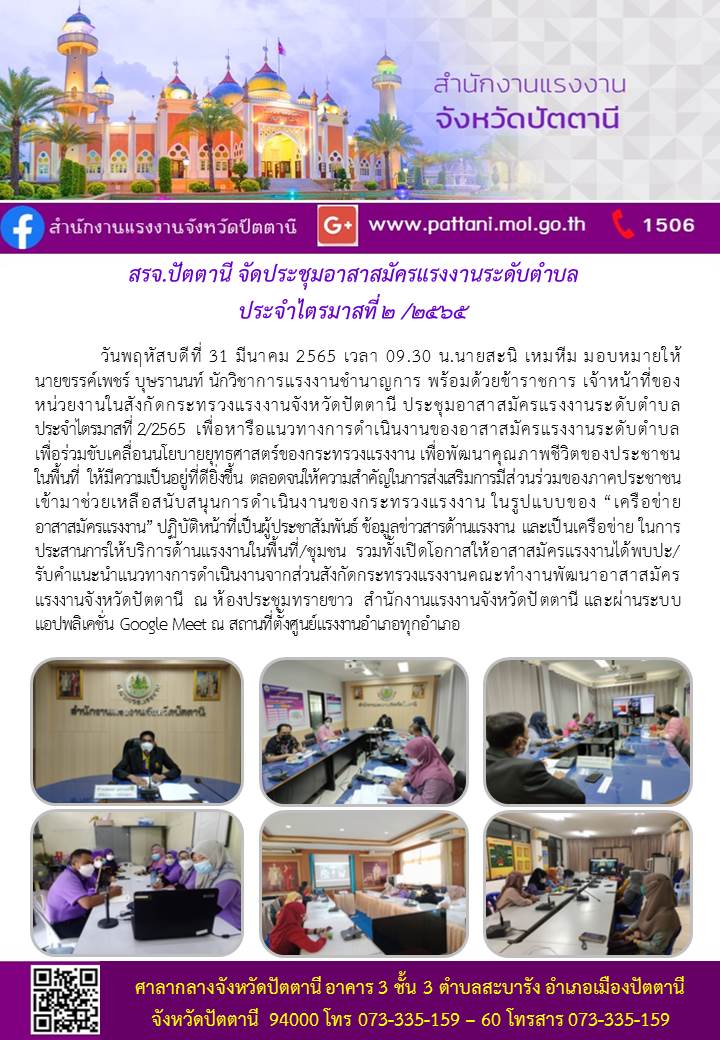 สรจ.ปัตตานี จัดประชุมอาสาสมัครแรงงานระดับตำบล ประจำไตรมาสที่ ๒ /๒๕๖๕