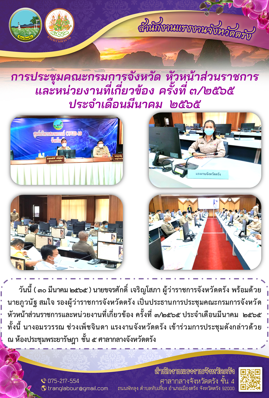 แรงงานจังหวัดตรัง ร่วมการประชุมคณะกรมการจังหวัด หัวหน้าส่วนราชการและหน่วยงานที่เกี่ยวข้อง ครั้งที่ ๓/๒๕๖๕ ประจำเดือนมีนาคม ๒๕๖๕