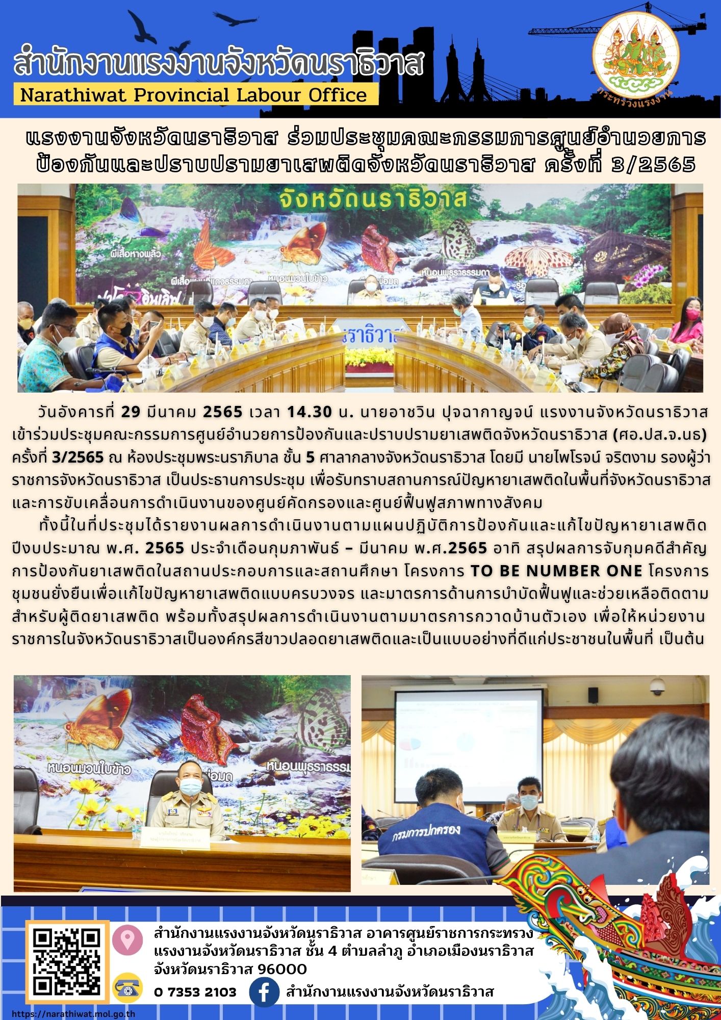 แรงงานจังหวัดนราธิวาส ร่วมประชุมคณะกรรมการศูนย์อำนวยการป้องกันและปราบปรามยาเสพติดจังหวัดนราธิวาส ครั้งที่ 3/2565