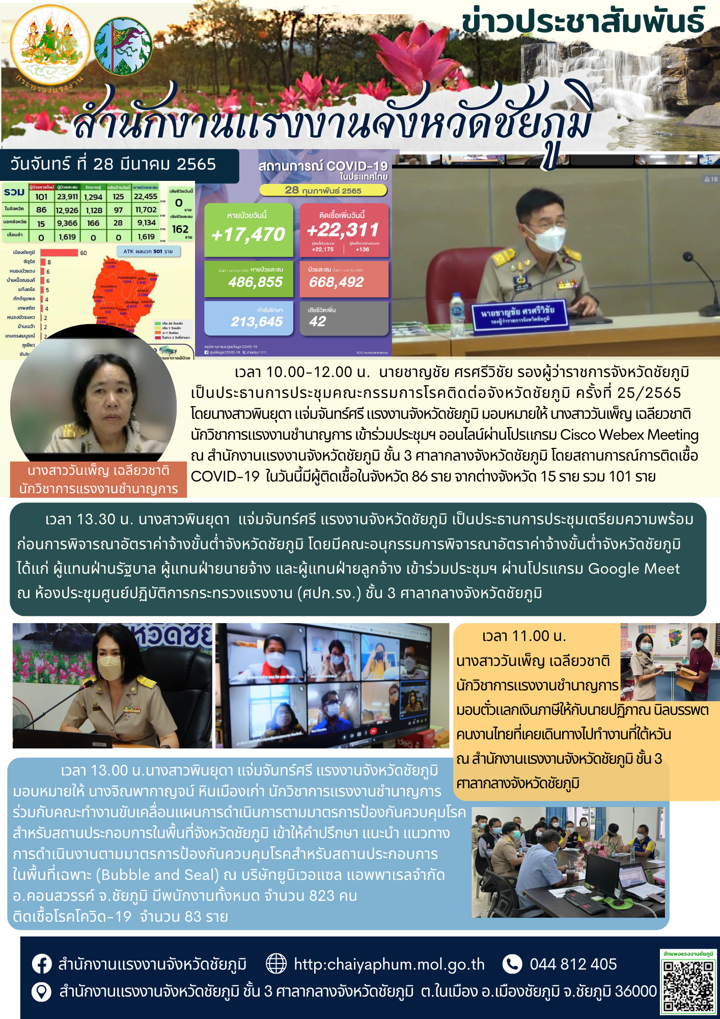 ข่าวประชาสัมพันธ์ สำนักงานแรงงานจังหวัดชัยภูมิ ประจำวันจันทร์ที่ 28 มีนาคม 2565