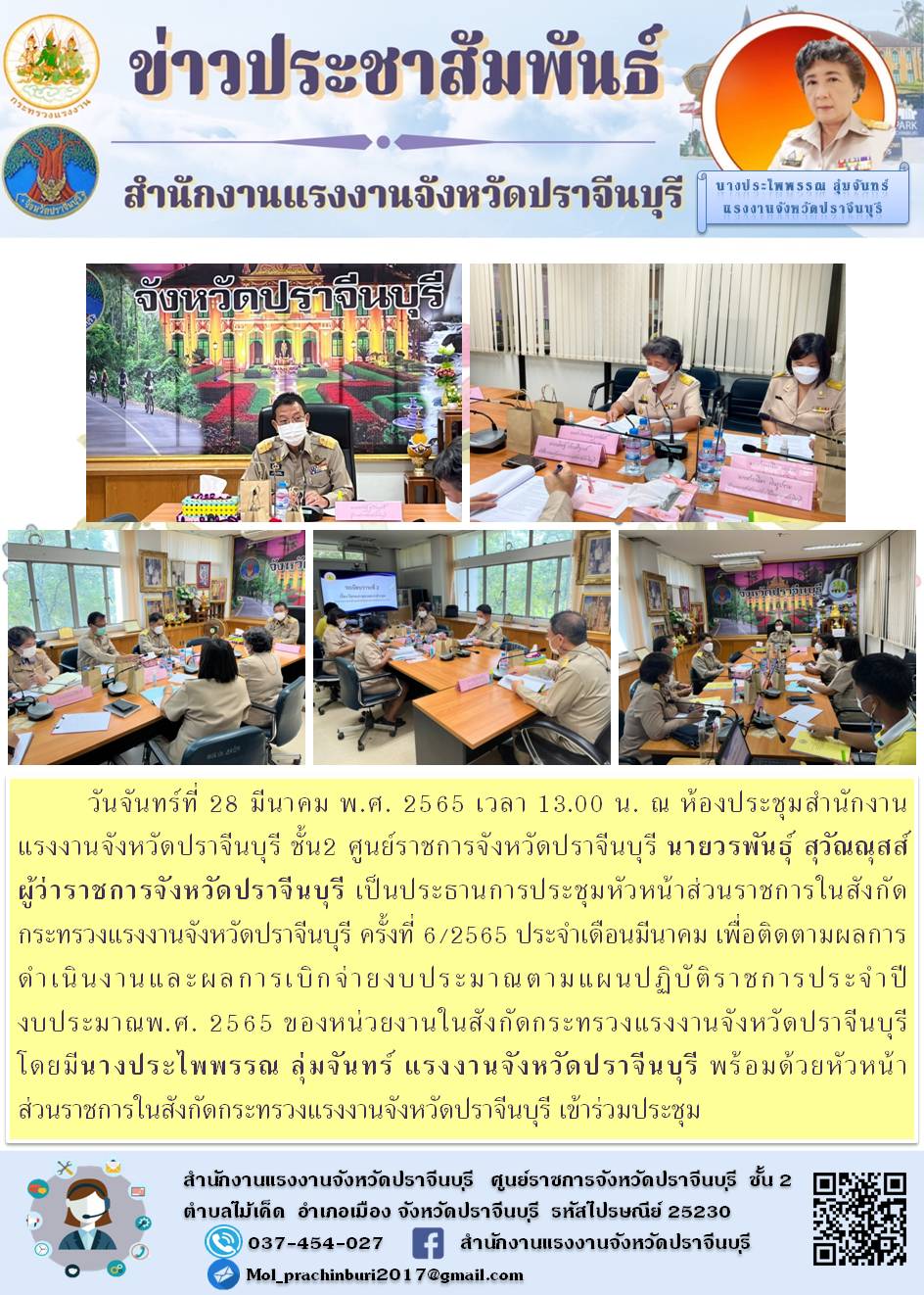 นายวรพันธุ์ สุวัณณุสส์ ผู้ว่าราชการจังหวัดปราจีนบุรี เป็นประธานการประชุมหัวหน้าส่วนราชการในสังกัดกระทรวงแรงงานจังหวัดปราจีนบุรี ครั้งที่ 6/2565 ประจำเดือนมีนาคม
