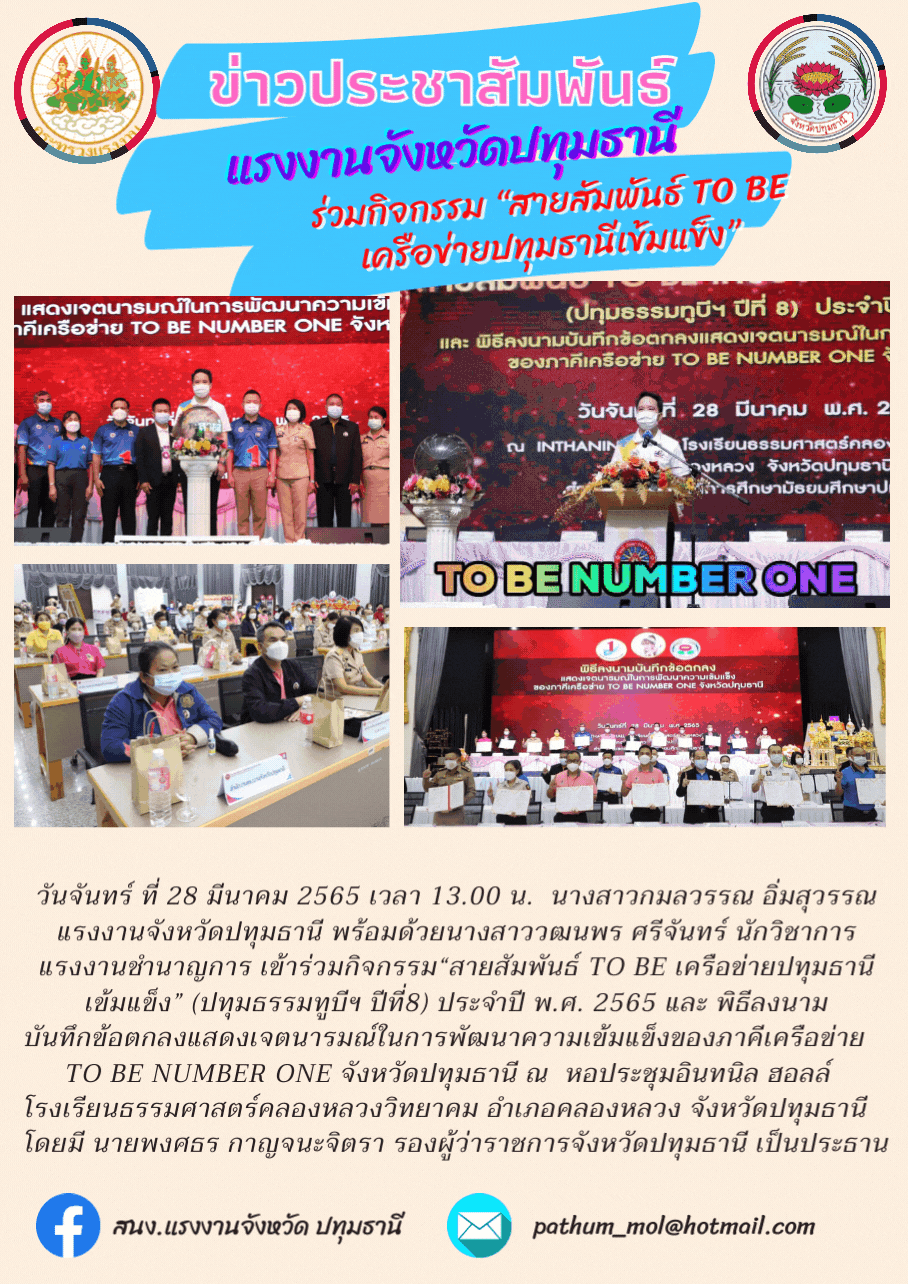 แรงงานจังหวัดปทุมธานี ร่วมกิจกรรม “สายสัมพันธ์ TO BE เครือข่ายปทุมธานีเข้มแข็ง” (ปทุมธรรมทูบีฯ ปีที่8) ประจำปี พ.ศ. 2565