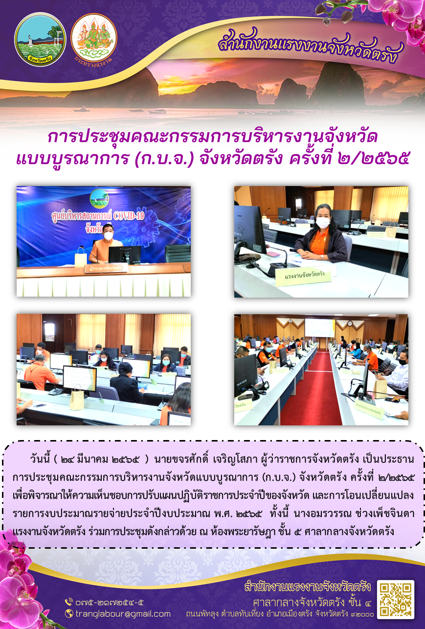 แรงงานจังหวัดตรัง ร่วมการประชุมคณะกรรมการบริหารงานจังหวัดแบบบูรณาการ (ก.บ.จ.) จังหวัดตรัง ครั้งที่ ๒/๒๕๖๕
