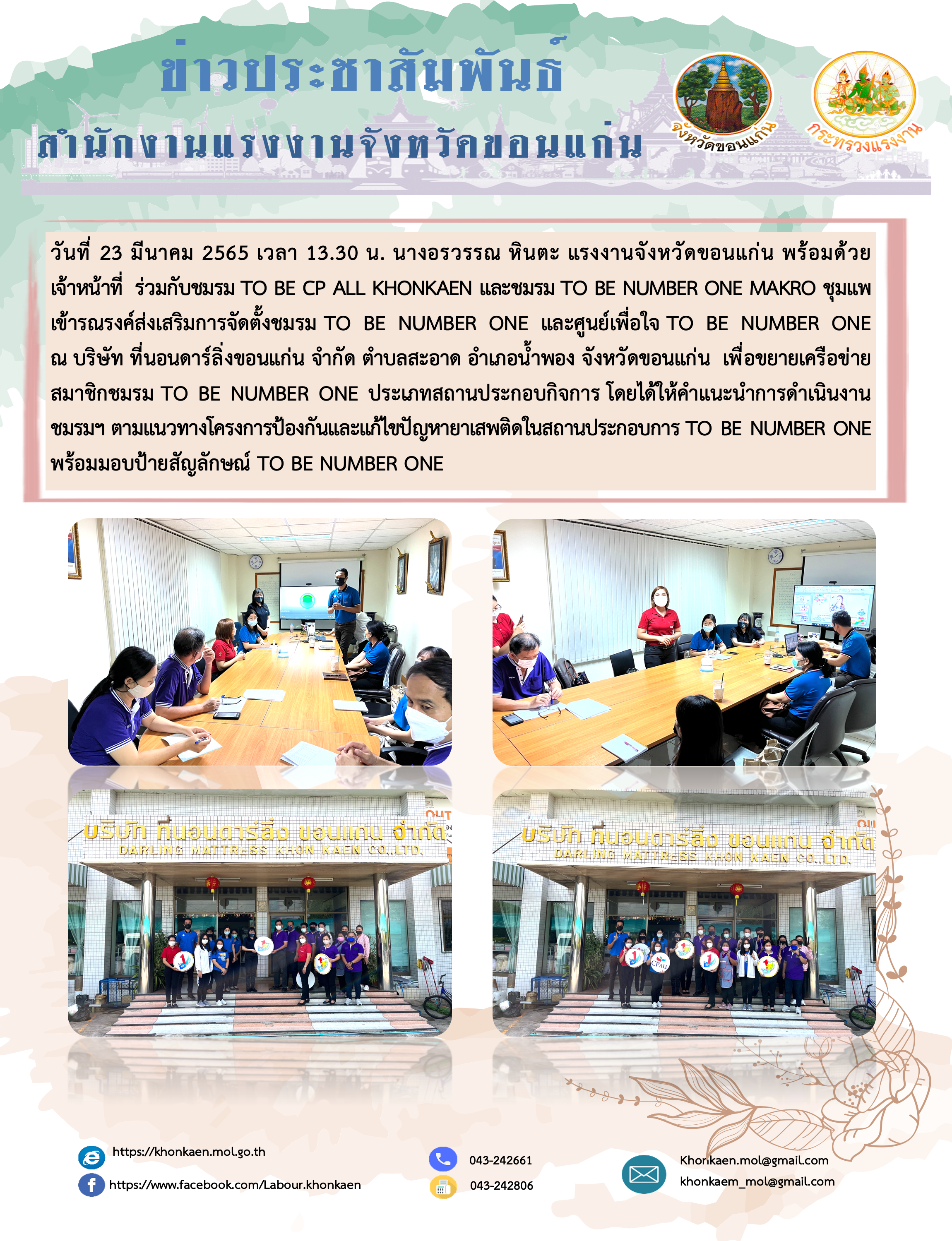 สำนักงานแรงงานจังหวัดขอนแก่น พร้อมด้วยเจ้าหน้าที่ร่วมกับชมรม TO BE CP ALL KHONKAEN และชมรม TO BE NUMBER ONE MAKRO ชุมแพ เข้ารณรงค์ส่งเสริมการจัดตั้งชมรม TO BE NUMBER ONE ณ บริษัท ที่นอนดาร์ลิ่งขอนแก่น จำกัด