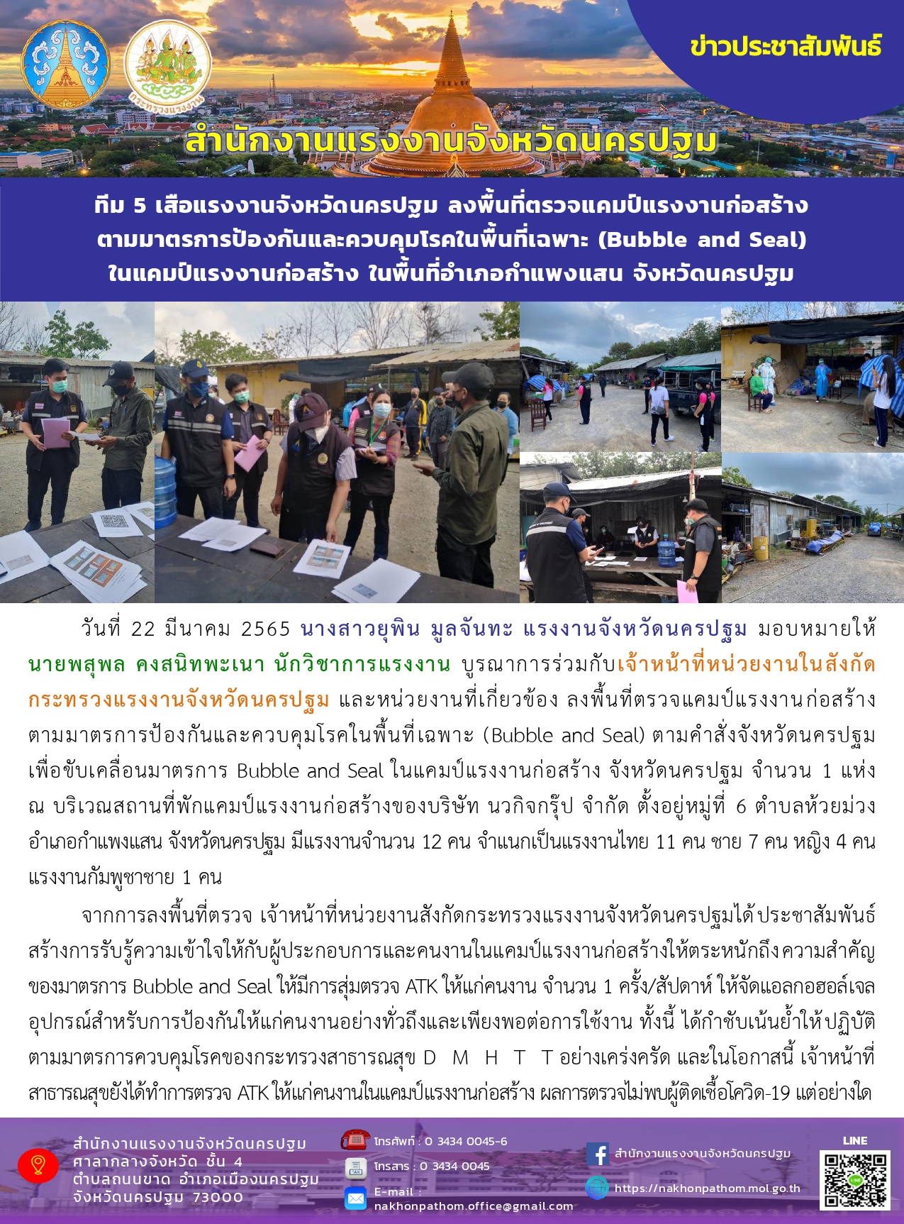 ทีม 5 เสือแรงงานจังหวัดนครปฐม ลงพื้นที่ตรวจแคมป์แรงงานก่อสร้างตามมาตรการป้องกันและควบคุมโรคในพื้นที่เฉพาะ (Bubble and Seal) ในแคมป์แรงงานก่อสร้าง
