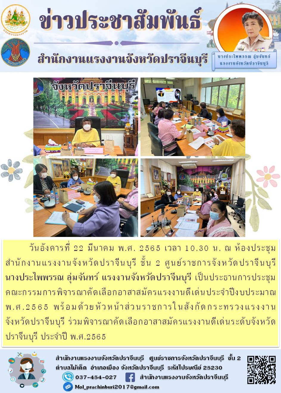 แรงงานจังหวัดปราจีนบุรี เป็นประธานการประชุมคณะกรรมการพิจารณาคัดเลือกอาสาสมัครแรงงานดีเด่นประจำปีงบประมาณ พ.ศ.2565