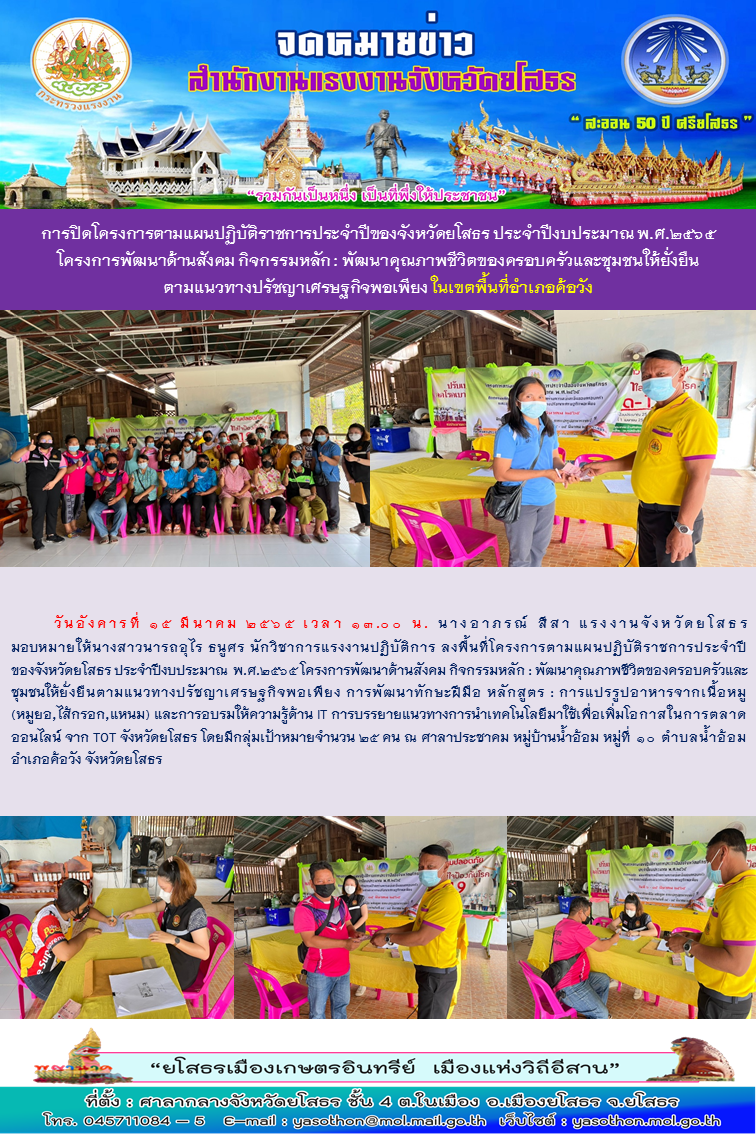 การปิดโครงการตามแผนปฏิบัติราชการประจำปีของจังหวัดยโสธร ประจำปีงบประมาณ พ.ศ.2565 โครงการพัฒนาด้านสังคม กิจกรรมหลัก : พัฒนาคุณภาพชีวิตของครอบครัวและชุมชนให้ยั่งยืนตามแนวทางปรัชญาเศรษฐกิจพอเพียง ในเขตพื้นที่อำเภอค้อวัง