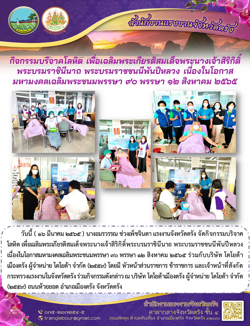 แรงงานจังหวัดตรัง จัดกิจกรรมบริจาคโลหิต เพื่อเฉลิมพระเกียรติสมเด็จพระนางเจ้าสิริกิติ์พระบรมราชินีนาถ พระบรมราชชนนีพันปีหลวง เนื่องในโอกาสมหามงคลเฉลิมพระชนมพรรษา ๙๐ พรรษา ๑๒ สิงหาคม ๒๕๖๕