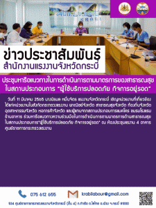 แรงงานจังหวัดกระบี่ประชุมหารือแนวทางในการดำเนินการตามมาตรการของสาธารณสุขในสถานประกอบการ “ผู้ใช้บริการปลอดภัย กิจการอยู่รอด”