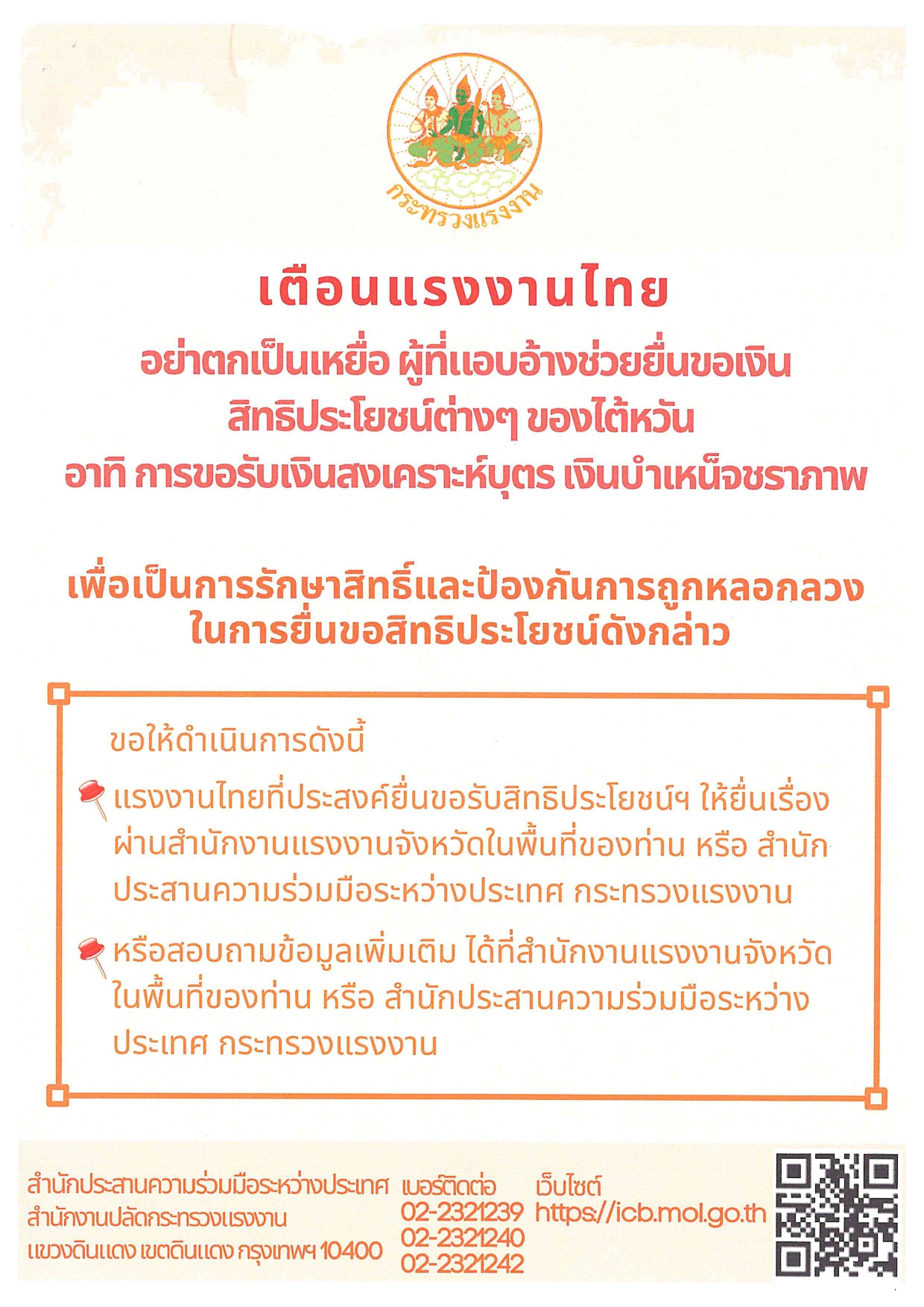 เตือนแรงงานไทยอย่าตกเป็นเหยื่อ ผู้ที่แอบอ้างช่วยยื่นขอเงินสิทธิประโยชน์ต่าง ๆ ของไต้หวัน