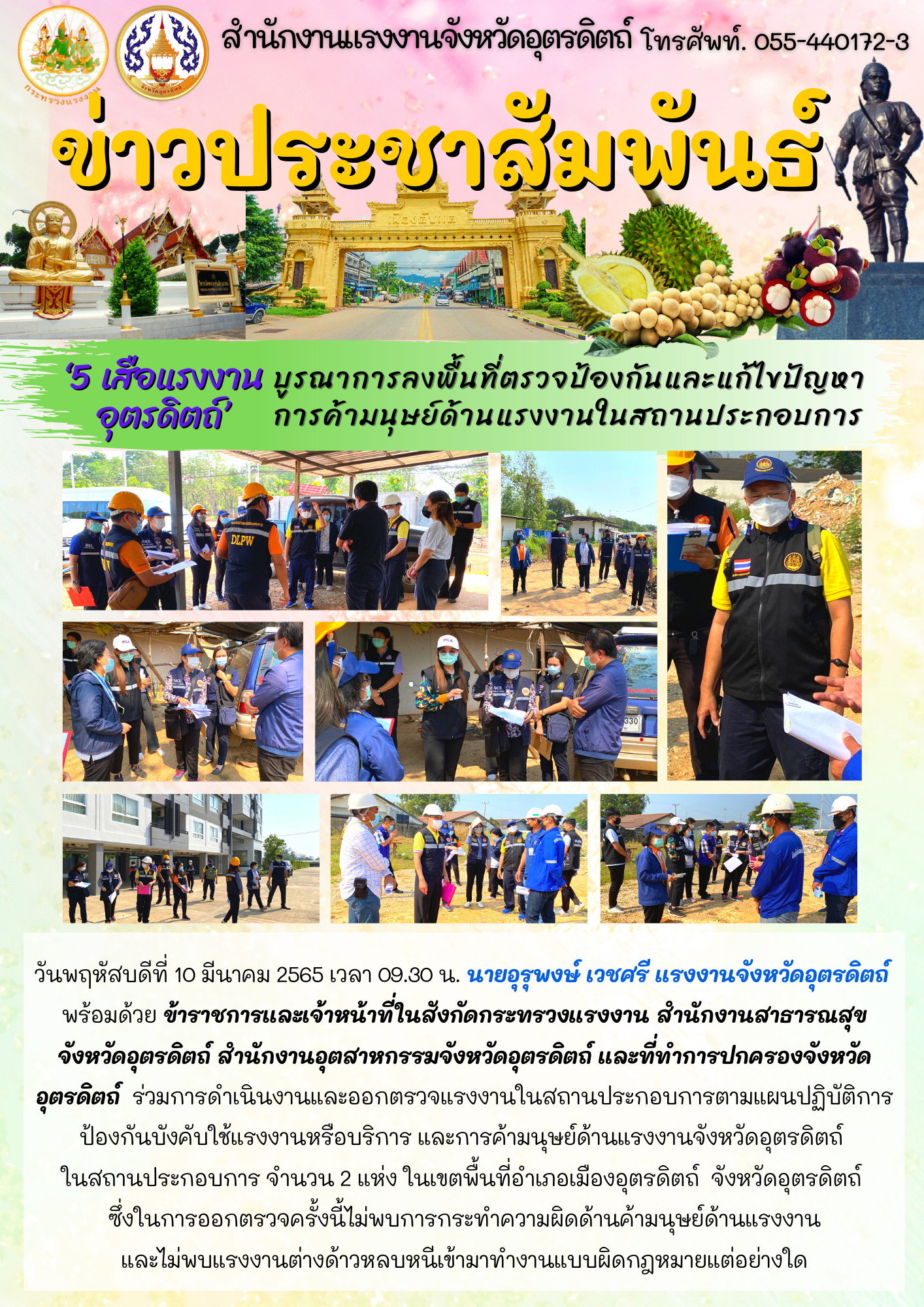 ‘5 เสือแรงงานอุตรดิตถ์’ บูรณาการลงพื้นที่ตรวจป้องกันและแก้ไขปัญหา การค้ามนุษย์ด้านแรงงานในสถานประกอบการ