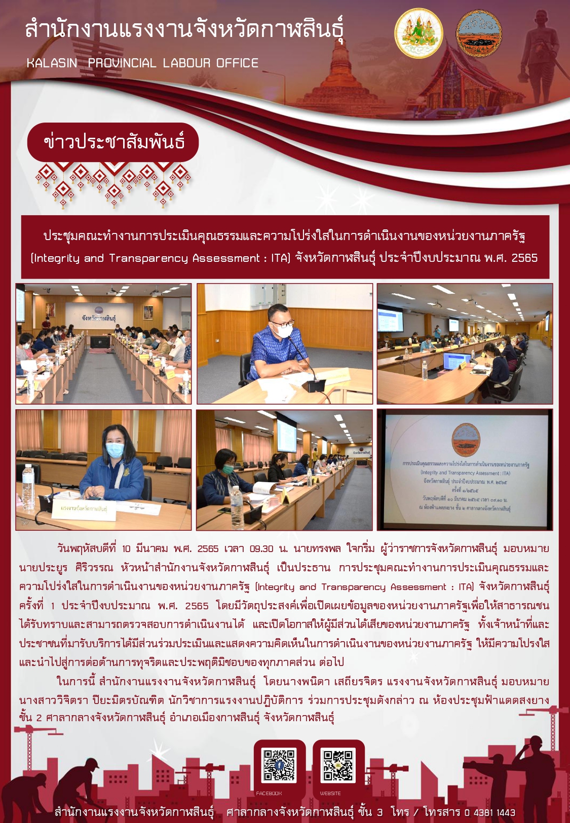สรจ.กาฬสินธุ์ ร่วมประชุมคณะทำงานการประเมินคุณธรรมและความโปร่งใสในการดำเนินงานของหน่วยงานภาครัฐ (Integrity and Transparency Assessment : ITA) จังหวัดกาฬสินธุ์