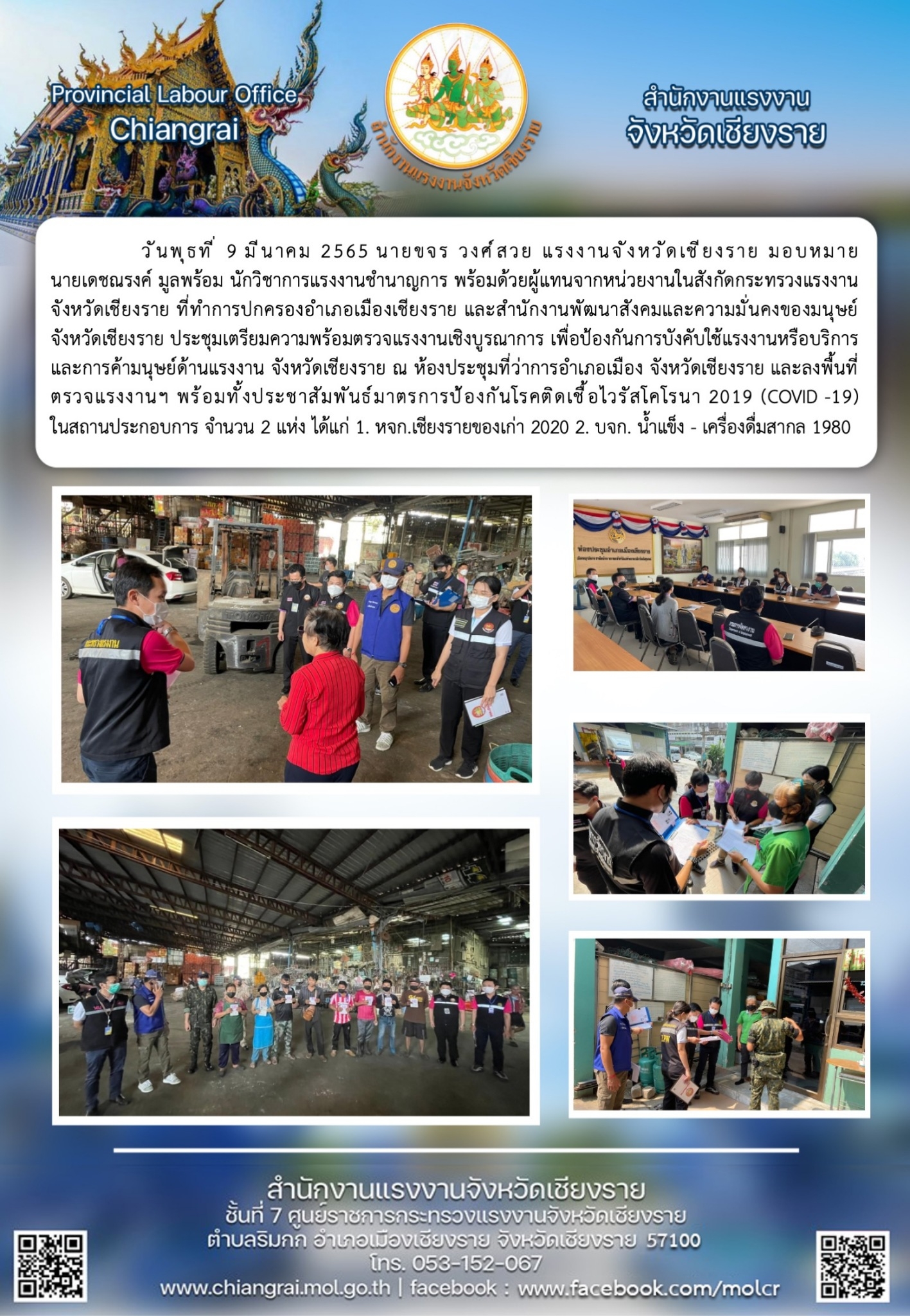 สรจ.ชร พร้อมด้วยผู้แทนจากหน่วยงานสังกัดกระทรวงแรงงาน ที่ทำการปกครองอำเภอเมืองเชียงราย และพมจ.ชร ประชุมเตรียมความพร้อมตรวจแรงงานเชิงบูรณาการ เพื่อป้องกันการบังคับใช้แรงงานหรือบริการและการค้ามนุษย์ ด้านแรงงาน และลงพื้นที่ตรวจฯ