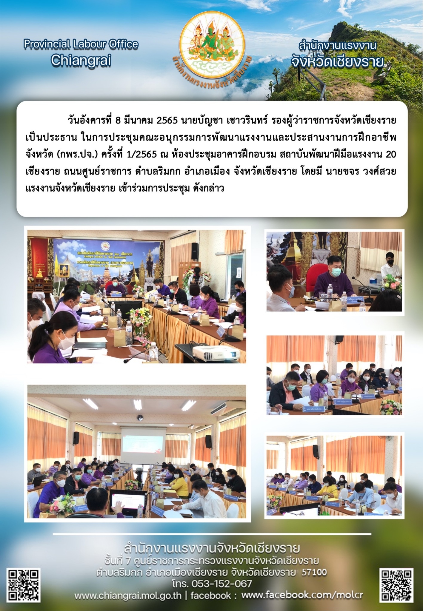 นายบัญชา เชาวรินทร์ รองผู้ว่าราชการจังหวัดเชียงราย เป็นประธาน ในการประชุมคณะอนุกรรมการพัฒนาแรงงานและประสานงานการฝึกอาชีพ จังหวัด (กพร.ปจ.) ครั้งที่ 1/2565