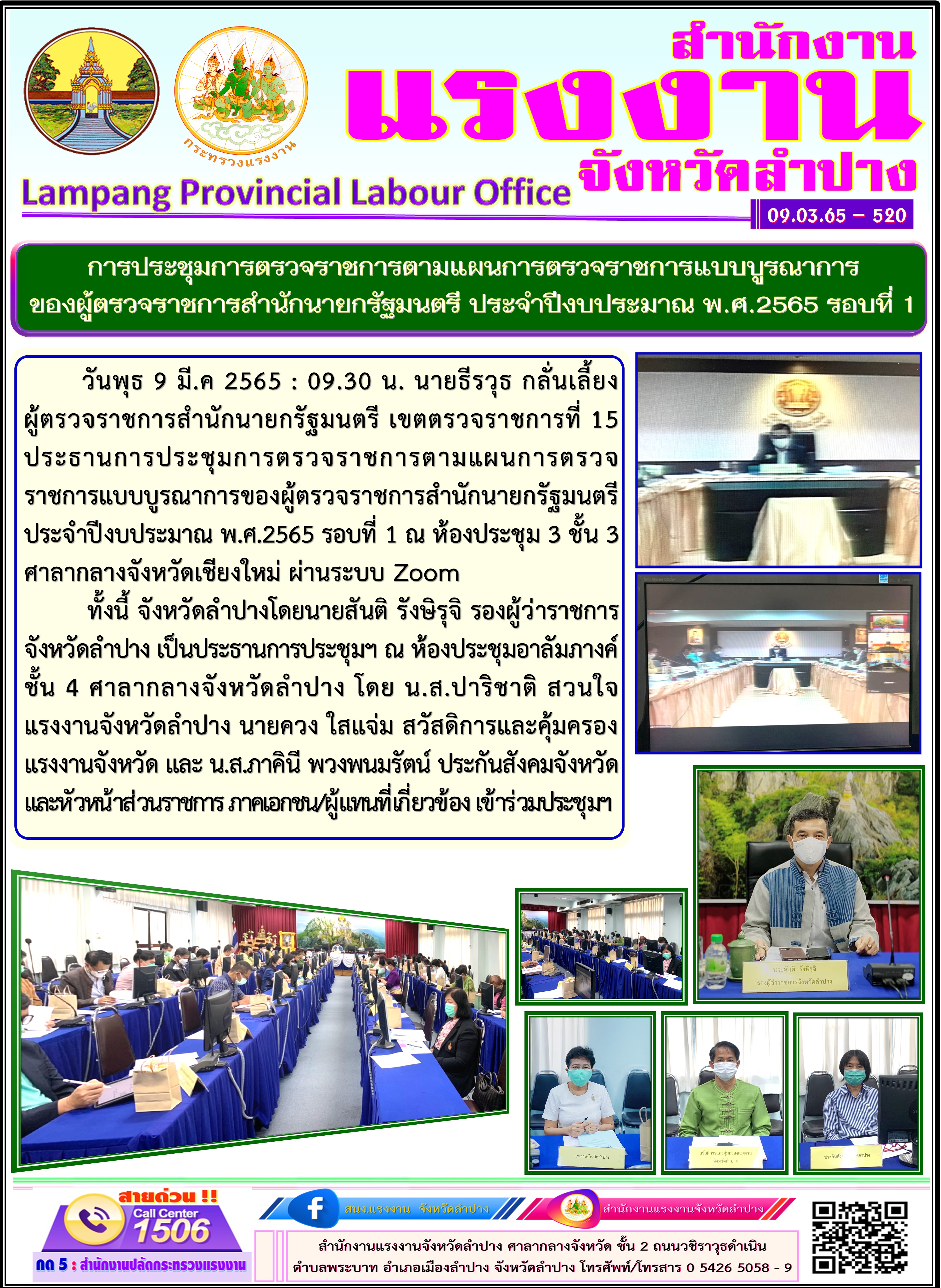 สรจ.ลำปาง ร่วมประชุมการตรวจราชการตามแผนการตรวจราชการแบบบูรณาการของผู้ตรวจราชการสำนักนายกรัฐมนตรี ประจำปีงบประมาณ พ.ศ.2565 รอบที่ 1 ผ่านระบบ Zoom