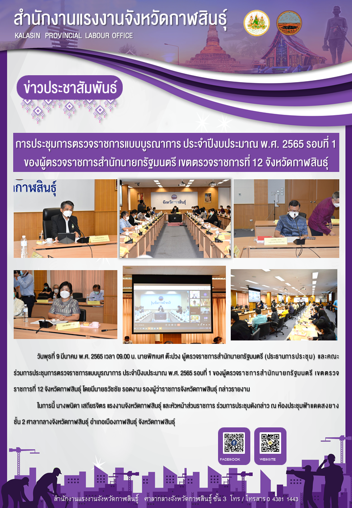 แรงงานจังหวัดกาฬสินธุ์ ร่วมการประชุมการตรวจราชการแบบบูรณาการ ประจำปีงบประมาณ พ.ศ. 2565 รอบที่ 1 ของผู้ตรวจราชการสำนักนายกรัฐมนตรี เขตตรวจราชการที่ 12 จังหวัดกาฬสินธุ์