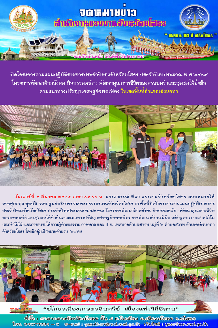 สรจ.ยโสธร ปิดโครงการตามแผนปฏิบัติราชการประจำปีของจังหวัดยโสธร ประจำปีงบประมาณ พ.ศ.2565 โครงการพัฒนาด้านสังคม กิจกรรมหลัก : พัฒนาคุณภาพชีวิตของครอบครัวและชุมชนให้ยั่งยืนตามแนวทางปรัชญาเศรษฐกิจพอเพียง ในเขตพื้นที่อำเภอเลิงนกทา