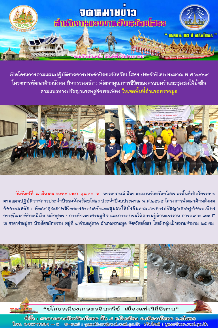 สรจ.ยโสธร เปิดโครงการตามแผนปฏิบัติราชการประจำปีของจังหวัดยโสธร ประจำปีงบประมาณ พ.ศ.2565 โครงการพัฒนาด้านสังคม กิจกรรมหลัก : พัฒนาคุณภาพชีวิตของครอบครัวและชุมชนให้ยั่งยืนตามแนวทางปรัชญาเศรษฐกิจพอเพียง ในเขตพื้นที่อำเภอทรายมูล
