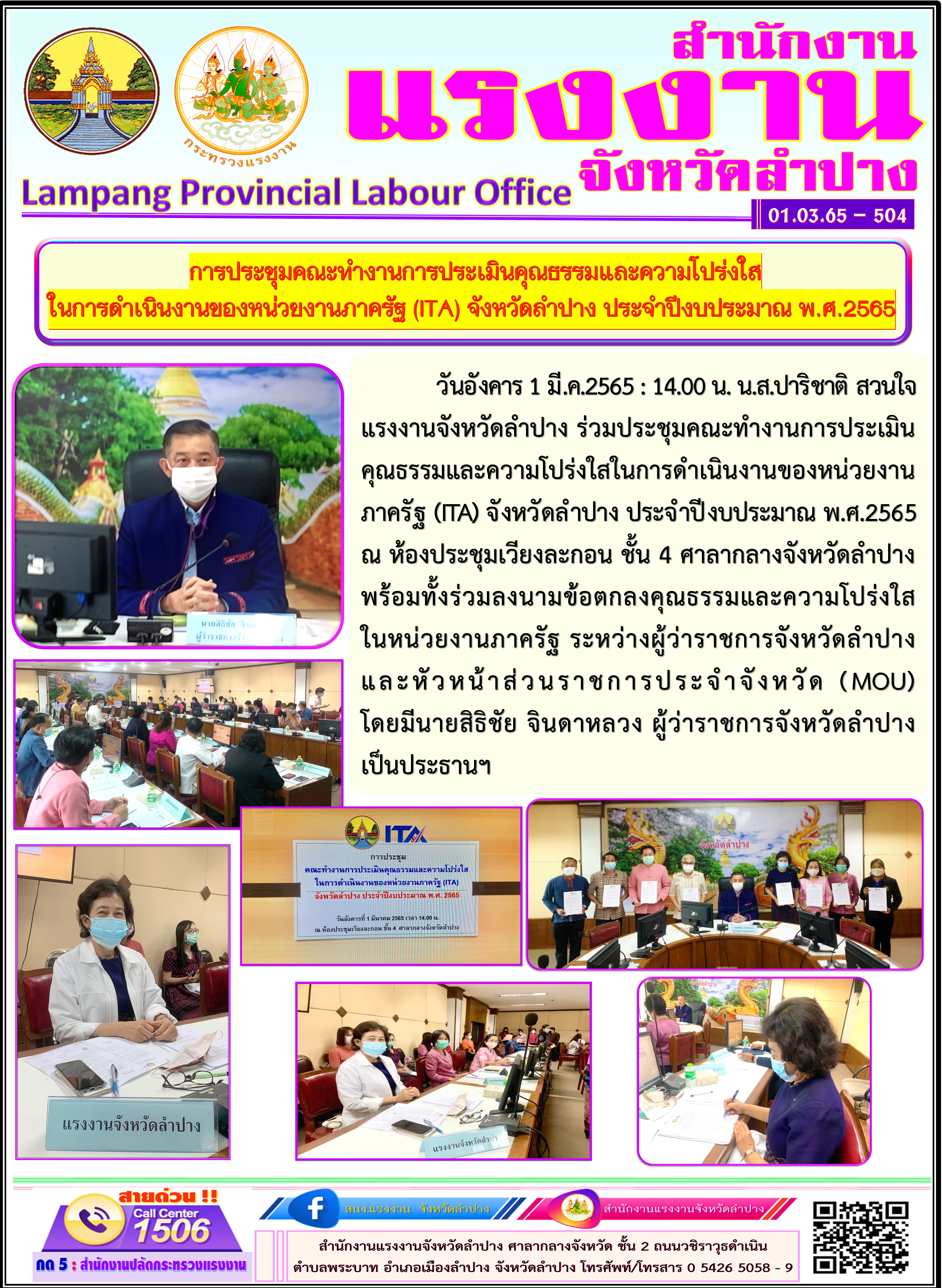 สรจ.ลำปาง ร่วมประชุมคณะทำงานการประเมินคุณธรรมและความโปร่งใสในการดำเนินงานของหน่วยงานภาครัฐ (ITA) จังหวัดลำปาง ประจำปีงบประมาณ พ.ศ. 2565