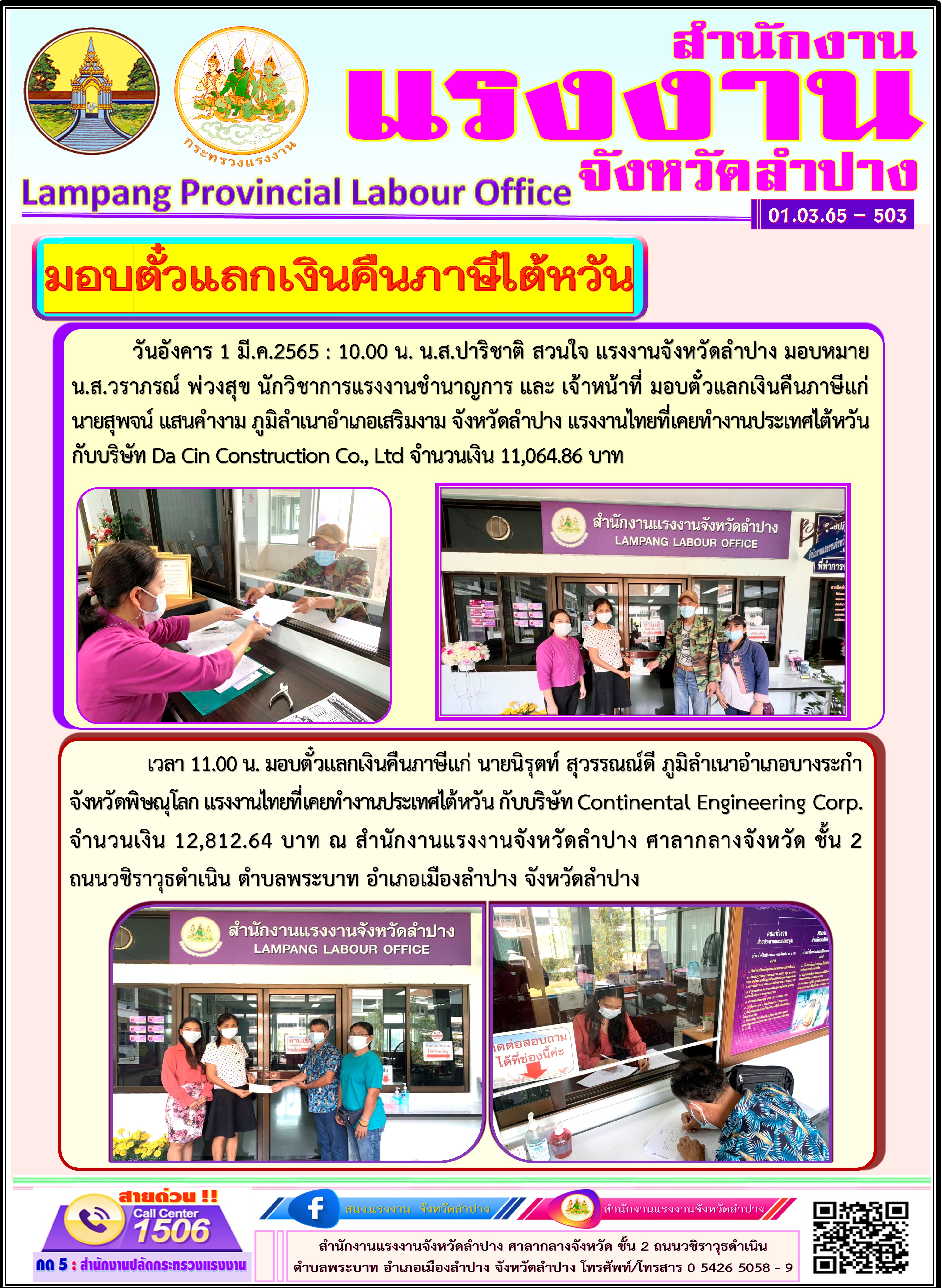สรจ.ลำปาง มอบตั๋วแลกเงินคืนภาษีไต้หวัน