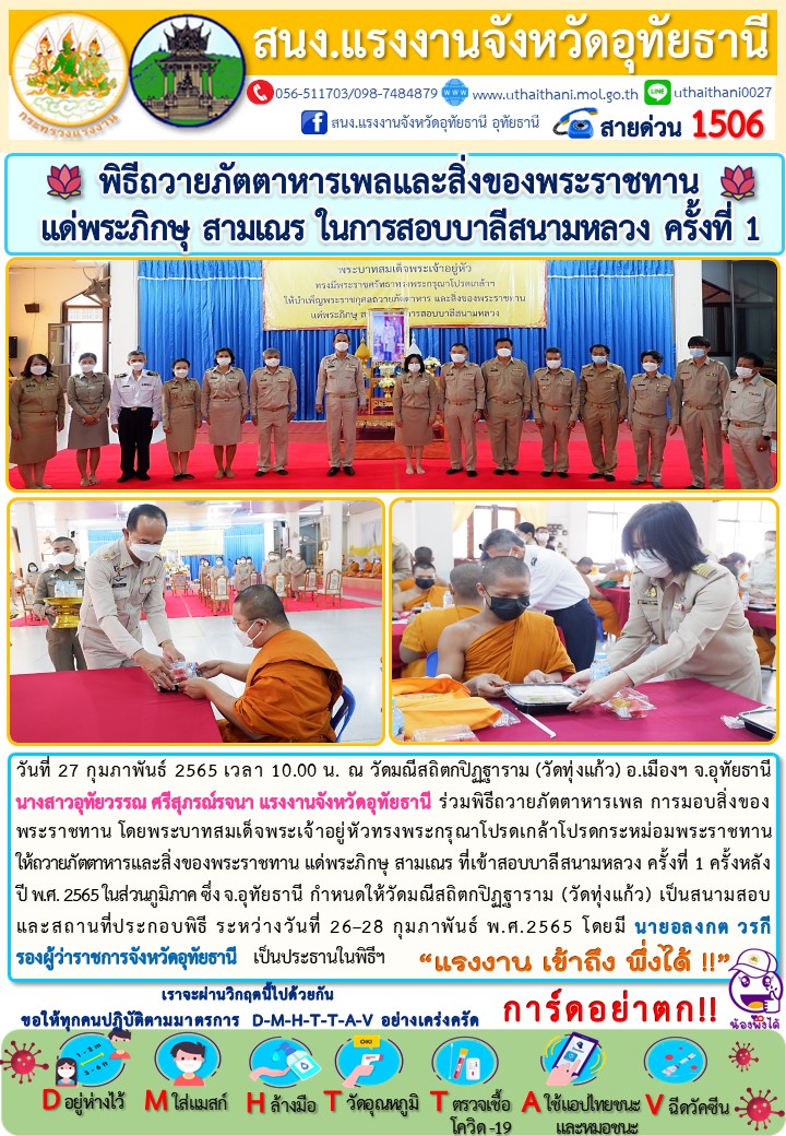 สำนักงานแรงงานจังหวัดกระบี่ ร่วมพิธีถวายภัตตาหารเพลและสิ่งของพระราชทานของพระบาทสมเด็จพระเจ้าอยู่หัว ถวายแด่พระภิกษุ สามเณร ในการสอบบาลีสนามหลวง ครั้งที่ 1 ครั้งหลัง ประจำปี พ.ศ. 2565