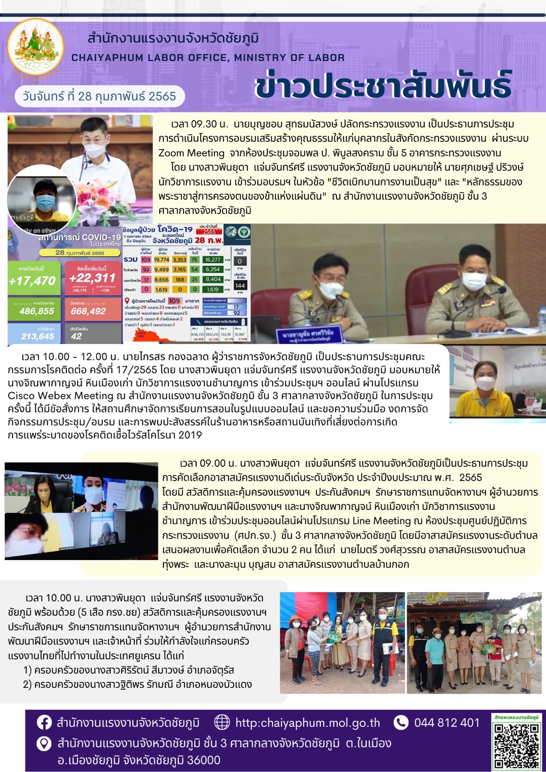 ภารกิจสำนักงานแรงงานจังหวัดชัยภูมิ ประจำวันที่ 28 กุมภาพันธ์ 2565